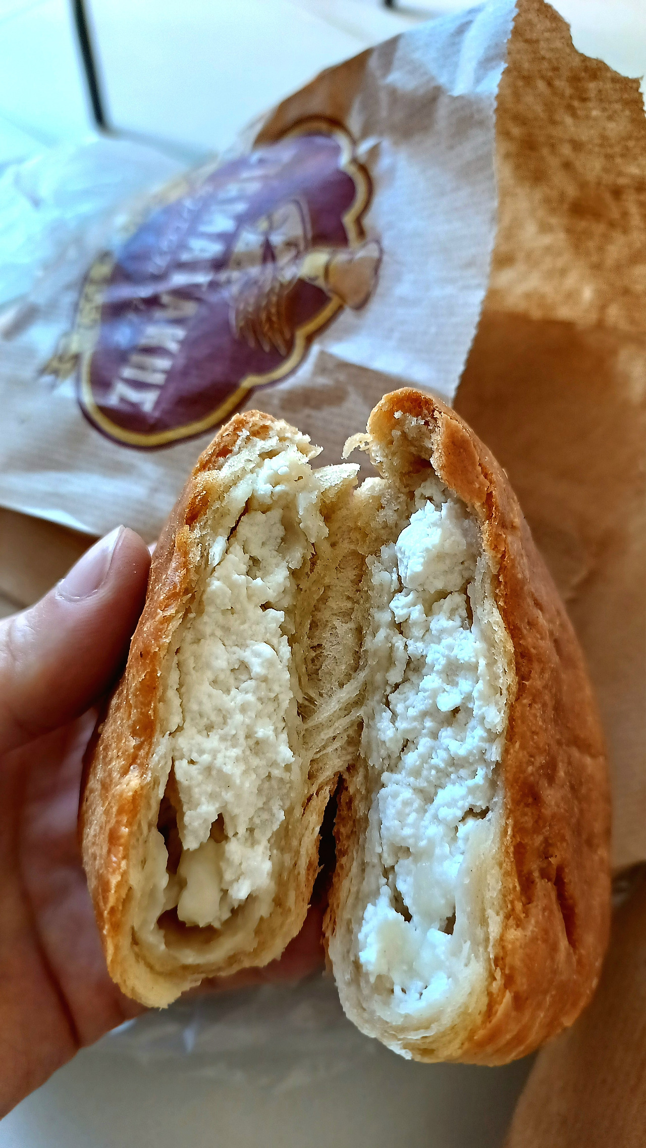 숙소로 걸어오며 빵 냄새와 허기를 못 이기고 피로스키 하나를 꺼내 반으로 가른다. 하얀 페타 치즈가 아낌없이 채워져 있다. 첫 입에 치즈의 향이 강하게 올라온다. 이어 짠맛이 뒤따른다. 치즈의 풍미는 진하지만, 전체적으로 짠 편이다. 달리기로 몸의 수분이 빠져나간 후라 그럴지도 모르겠다. 우유와 함께 먹으면 맛있을 것 같다.