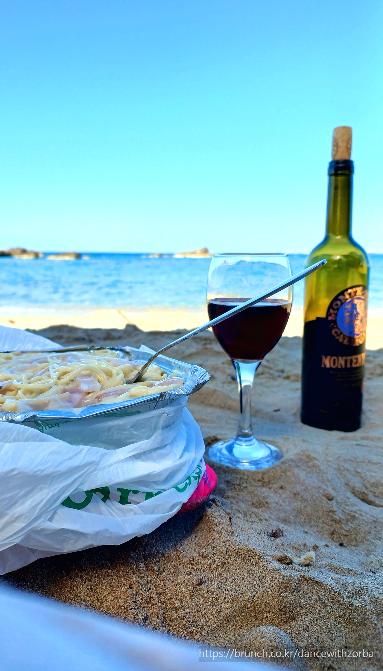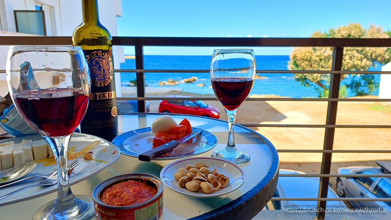 조르바가 한 말을 생각하며 천천히 브런치를 준비한다. 발코니 문을 열어두니 크레타의 바람이 주방까지 닿는다. 익숙한 음식을 차려 놓고, 와인도 딴다. 욕망이 부르면 대답하기로 한 '자유의 날'이니, 한낮의 와인도 문제 될 것 없다. 와인은 마트에서 구입한 크레타 산이다. 잔에 따르니 루비색과 자줏빛이 겹겹이 번진다. 햇살이 와인의 표면을 통과하며 잔 안쪽에 얇은 막을 만들고, 그 흔적이 천천히 내려앉는다.