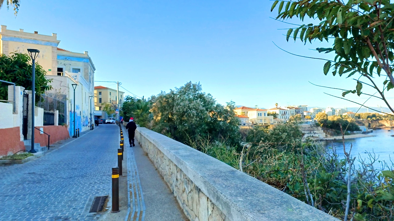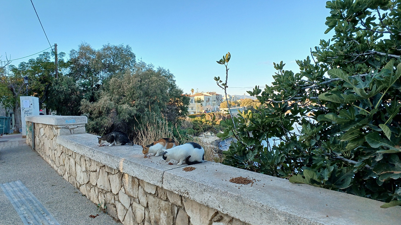 조금 더 달려 탐파카리아 동네에 들어선다. 바위에 부딪히는 파도 소리가 건물 사이로 울린다. 한때 가죽 공장이었던 건물들이 바다를 향해 서 있다. 어떤 것은 복원되어 카페가 되었고, 어떤 것은 여전히 허름한 집으로 남아있다. 새로 꾸민 공간과 벗겨진 외벽이 자연스럽게 어울린다. 약간의 경사와 불규칙한 바닥이라 속도를 늦춘다. 느릴수록 풍경은 눈에 더 잘 들어온다. 바다쪽 담장 위에는 고양이들이 아침을 먹고 있다. 누군가 고양이 사료를 한줌씩 담장에 얹어 놓았다. 따뜻한 인정이다. 터키만큼은 아니어도 그리스에도 고양이가 많다. 탐파카리아는 있는 그대로의 어촌 마을의 자연스움을 보여준다.