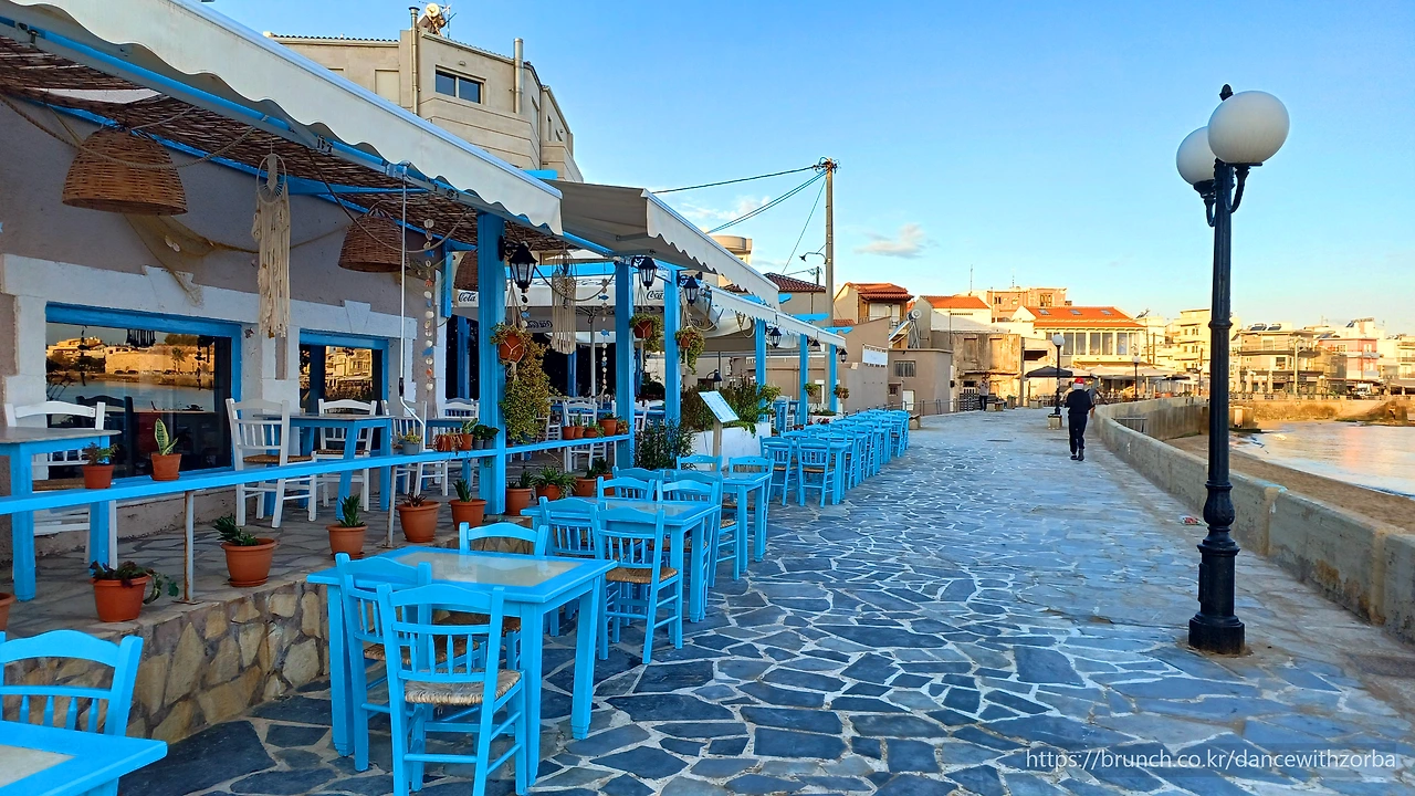 인기많은 항구 주변의 벤치도 비어 있다. 가게 앞을 정리하는 손길과 빗자루 쓰는 소리만 들린다. 이곳 항구는 베네치아인들이 남긴 성벽과 창고, 오스만의 흔적이 누적된 장소지만, 이 시간만큼은 역사도 숨을 고른다. 우리는 그 사이를 물고기처럼 빠져 나간다.