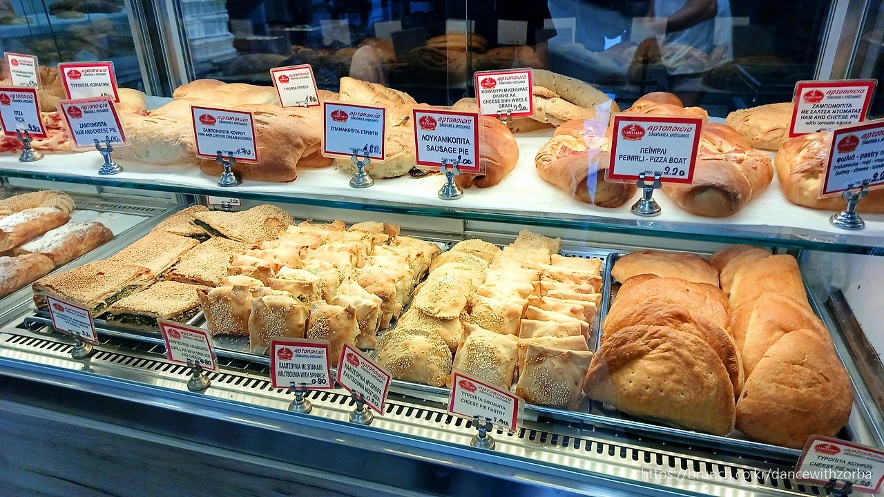 카운터 앞에는 동네 노부부와 장을 보러 나온 주민, 배낭을 멘 여행자가 뒤섞여 서 있다. 주인은 손짓과 짧은 말로 빵을 설명하고, 사람들은 고개를 끄덕이며 자기 몫의 빵 고른다. 나는 조그만 파운드 케잌과 페타 치즈가 들어간 빵 두 개를 지목한다. 아테네에서도 먹어봤던 피로스키(유사 고로케)다. 겉은 바삭하고 속은 부드럽게 부풀어 있다. 종이봉투에 담긴 빵을 들고 가게를 나오니, 손끝과 옷자락에 고소한 냄새가 배었다. 기분마저 고소해진다.