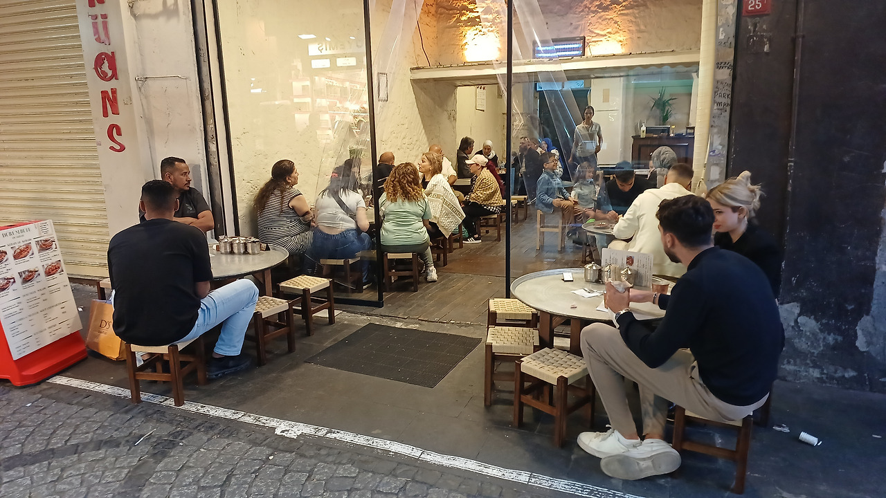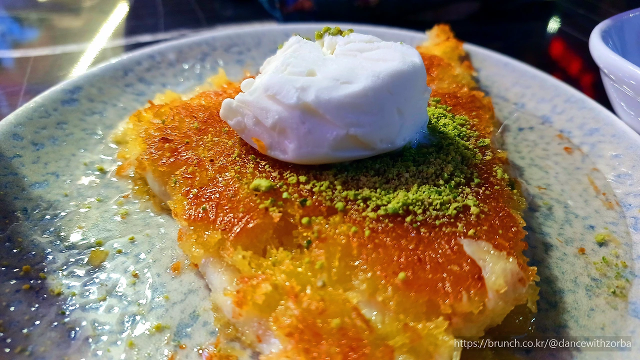 그때 골목 모퉁이에서 눈길을 사로잡는 음식이 보인다. 철판 위에서 노릇하게 구워지는 낯선 디저트. 처음엔 한국의 빈대떡 같았지만, 그 위에 아이스크림을 얹어 내오는 걸 보고 ‘이건 뭔가 다르다’는 생각이 든다. 호기심과 식욕을 동시에 자극한다. 주문하고 자리를 잡자, 달콤한 향이 퍼지며 금빛 디저트가 은접시에 담겨 나온다. 옆자리에 앉은 커플이 미소를 지으며 이름을 알려준다. “쾨네페(Kunefe),” 그들이 알려준 음식 이름이다. 이란에서 왔다는 그들은 여행자가 아니라, 이곳에서 새 삶을 시작하려고 한단다. 젊고 싱싱한 웃음을 지닌 사람들이다. 짧은 인사와 웃음이 오간 뒤, 나는 포크를 들어 쾨레페를 한 입 베어 문다. 바삭한 실면 위로 녹아드는 치즈, 그리고 차가운 아이스크림이 섞이며 퍼지는 달콤한 열기. 디저트라기보다 하루의 피로를 녹이는 위로의 맛이다. 당분 때문인지, 아니면 오랜만에 ‘진짜' 맛을 만난 기쁨 때문인지, 기분이 한결 밝아지고, 몸에 다시 힘이 돈다.