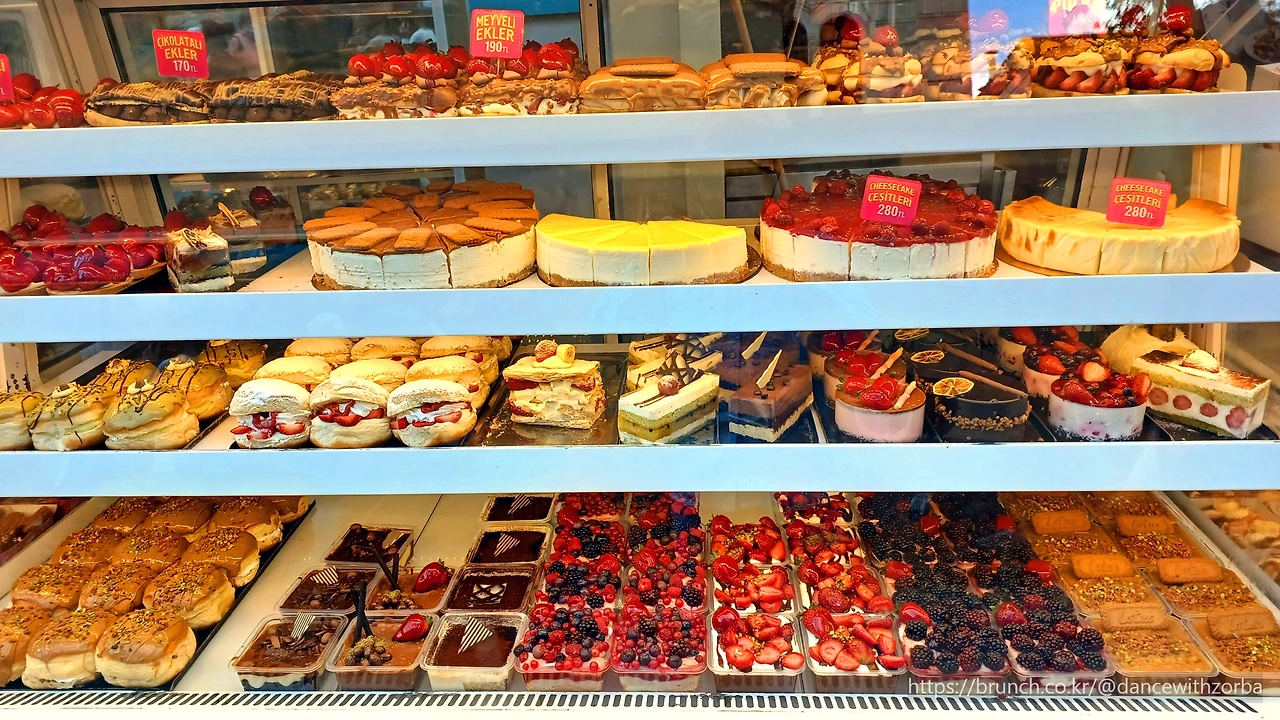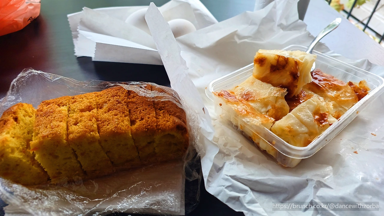 까르푸 슈퍼에서 우유, 요거트, 계란, 과일을 사고, 숙소 근처의 작은 빵집에서 백설기처럼 생긴 페이스트리 한 조각을 샀다.(이름은 여전히 모르지만, 튀르키예에서 먹은 빵 중 가장 맛있었다.) 숙소로 돌아와 에그 스크램블과 치즈 샐러드를 만들어 발코니 테이블 위에 차려놓는다. 종이 포장지를 조심스레 벗기자 따뜻한 빵 냄새가 퍼진다. 바삭한 겉면을 포크로 눌러 한 조각 떼어 입에 넣는다. 부드럽고 쫄깃하다. 담백한 고소함이 입안에 퍼지고, 새콤한 요거트에 이곳의 꿀을 섞어 먹으니 별미가 완성된다. 삶은 달걀을 베어 문 J의 얼굴에도 미소가 번진다.