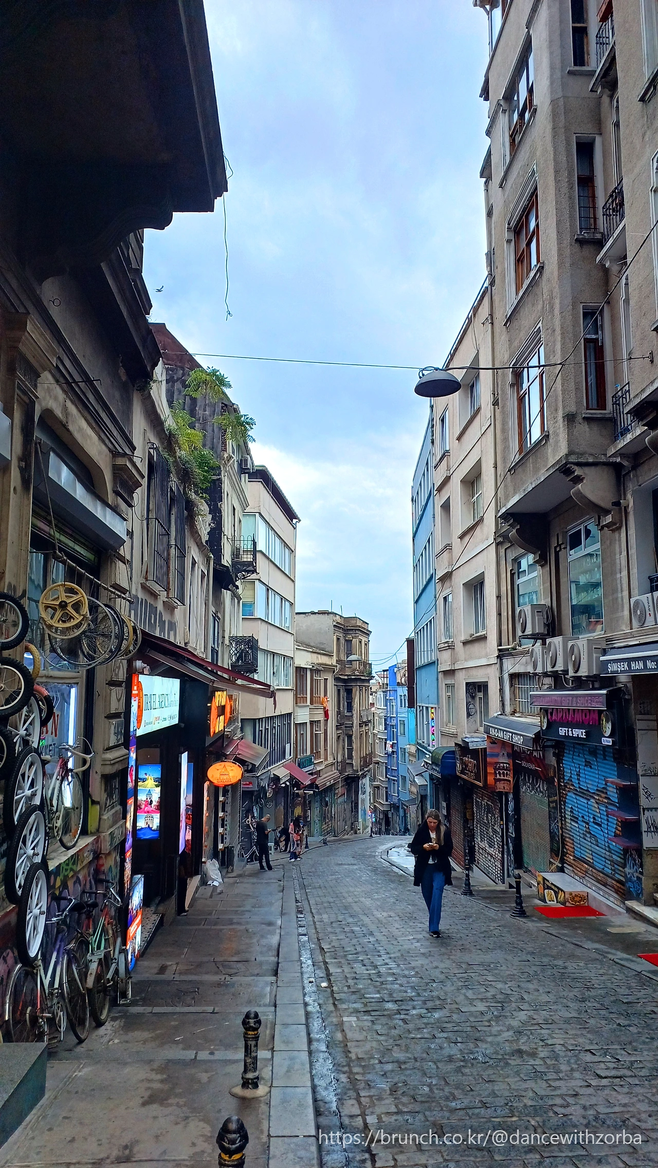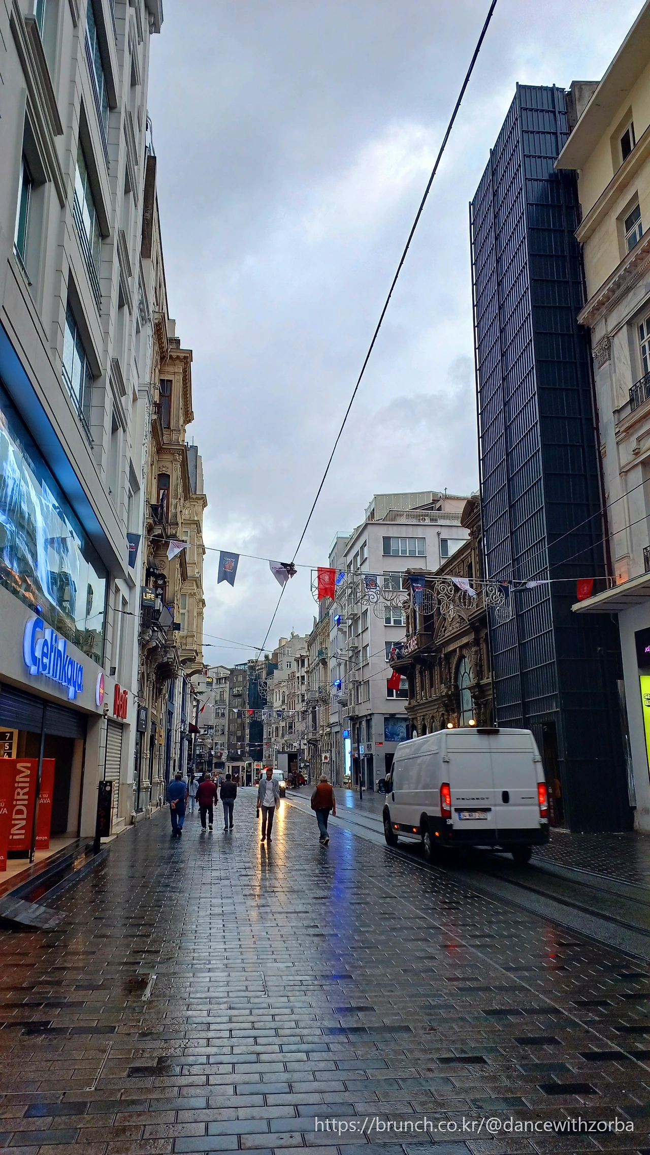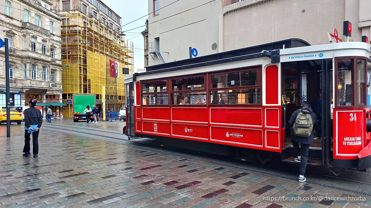 조금 걸어 들어가자 풍경이 확 달라진다. 유럽의 대도시 중심가의 풍경과 크게 다르지 않다. 거리 양옆으로 의류, 신발, 액세서리 매장들이 줄지어 있고, 커다란 유리창 너머로는 브랜드 로고들이 반짝인다. 비가 부슬부슬 내리는 이스티크랄 거리의 아침, 사람들은 많지 않다. 젖은 돌바닥이 희미한 불빛을 받아 반짝인다.