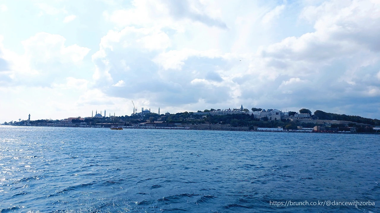 배가 천천히 나아가자, 구시가지의 풍경이 서서히 드러난다. 왼편으로는 톱카프 궁전의 붉은 지붕이 나무 사이로 보이고, 그 위로 뾰족한 아야 소피아의 돔과 술탄 아흐메트 모스크(Blue Mosque)의 첨탑이 겹쳐 보인다. 그 두 건물이 만들어내는 실루엣은 마치 두 문명이 서로를 비추는 거울 같다. 이곳이 과거 제국의 심장, 수많은 전쟁과 신앙의 물결이 교차하던 자리임을 굳이 역사책을 읽지 않아도 느낄 수 있다.