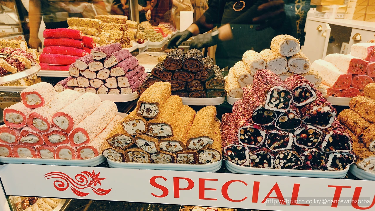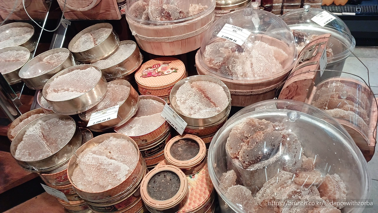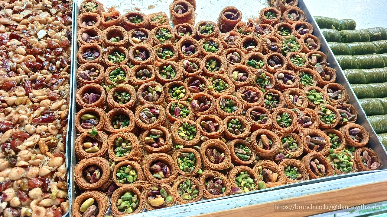 바자르는 입구부터 이미 향신료의 냄새가 코끝을 자극한다. 강황, 육두구, 시나몬, 사프란이 뒤섞여 공기마저 알록달록 해지는 기분이다. 좌우로는 유제품 가게와 건조과일 상점, 옷 가게와 기념품점이 빽빽하게 이어진다. 붉은 피망 분말과 노란 카레 가루, 초록빛 허브가 산처럼 쌓여 있고, 그 앞을 오가는 사람들의 얼굴마다 다른 나라의 언어가 흘러나온다. 이곳은 단지 시장이 아니라 세계의 축소판이다. 골목을 한참 따라 들어가자, 진한 커피 향이 퍼진다. 작은 로스터리 앞에는 길게 줄이 늘어서 있다. 현지 사람들이 줄을 선 걸 보니, 그 집은 분명 '진짜'다. 커피 냄새에 이끌려 조금 더 걷자, 이번엔 현지 반찬과 견과류, 말린 과일들이 진열된 상점들이 나온다. 이것은 맛이라기보다 색의 향연이다. 붉은 석류, 금빛 살구, 짙은 초콜릿 빛 호두와 피스타치오... 시장 한복판이 하나의 거대한 팔레트 같다.