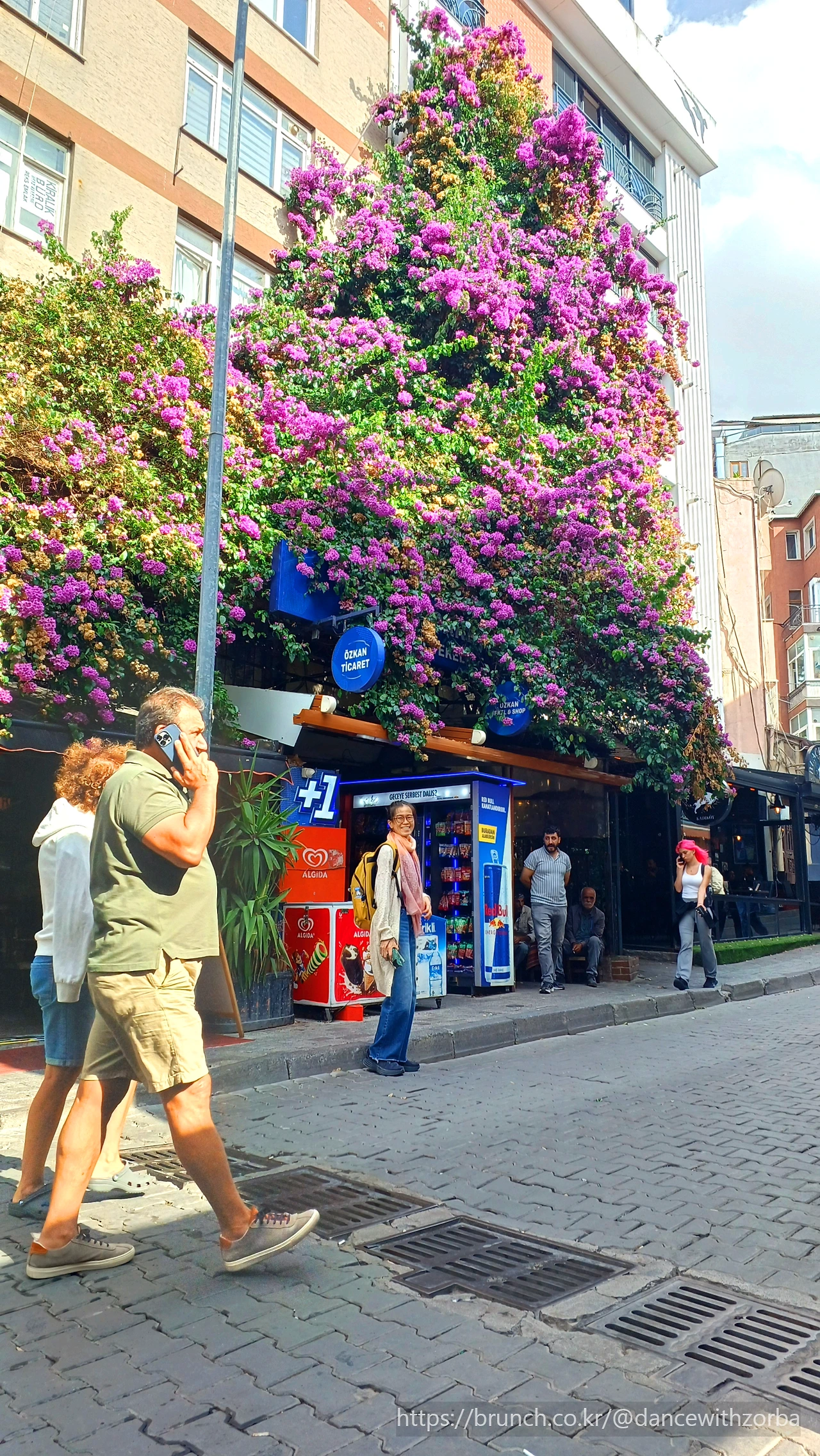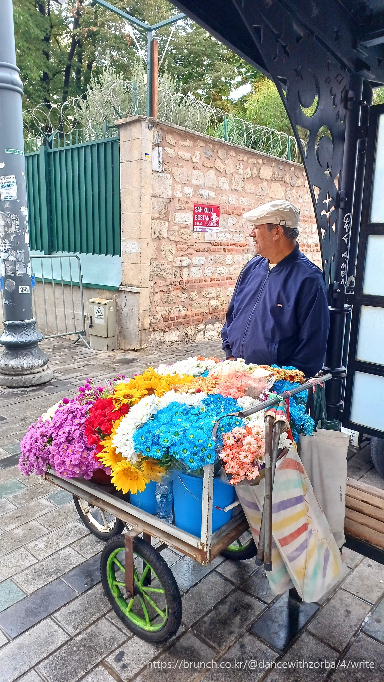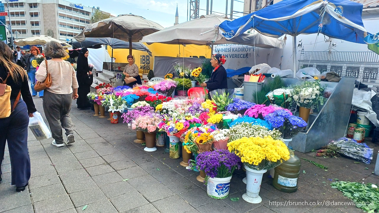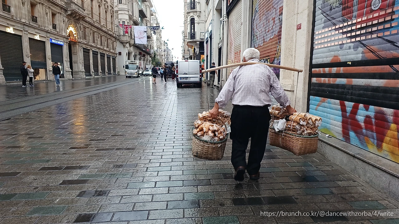 내 옆을 스치는 노인의 굽은 어깨에는 긴 봉 끝으로 커다란 바구니 두 개가 매달려 있다. 안에는 구운 빵들이 가득하다. 구부정한 등에서 세월과 노동의 무게가 느껴진다. 바구니가 흔들릴 때마다 빵 냄새가 퍼지고, 그 냄새가 비 냄새와 섞여 묘한 슬픔을 자아낸다. 그 뒤로 사람들은 아무 일 없다는 듯 우산을 쓰고 걸어간다. 조금 떨어진 모퉁이에는 꽃장수가 서 있다. 손이 시린지 두 손을 주머니에 찔러 넣은 채, 그는 색색의 꽃수레 옆에 서서 하늘을 본다. 물기 어린 도로 위에 붉은 장미, 노란 해바라기, 파란 국화가 더욱 선명하게 빛난다. 꽃과 아저씨의 대비가 아름다워 사진을 찍었지만, 찍은 사진을 다시 보니 생업의 고단함이 보인다. 이스티클랄 거리는 반짝이는 아름다움과 현실의 체온이 섞여 있다.