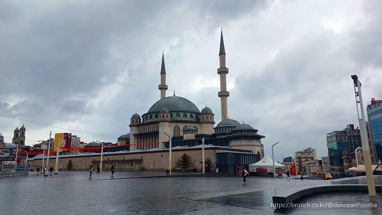 결국 우산을 들고 다시 밖으로 나온다. 달리기는 어렵겠지만 동네 정찰도 할 겸, 내일 아침 달릴 만한 코스를 미리 살펴보기로 한다. 탁심 광장에서 갈라타로 이어지는 도심이 어떤 모습인지도 궁금하다. 비는 그쳤다가 다시 내리길 반복한다. 도심을 대략 훑어보니, 가장 먼저 눈에 들어오는 것은 모스크다. 규모도 크지만, 도시의 배경 속에서 차지하는 존재감이 남다르다. 거의 500미터마다 하나씩 서 있는 거대한 돔과 미나렛은 각 구역의 이정표이자 정신적 중심이다. 탁심 광장의 왼편으로 모스크를 지나 오른편으로 돌면, 자연스레 이스티클랄 거리(İstiklal Caddesi)로 이어지는 구조다.