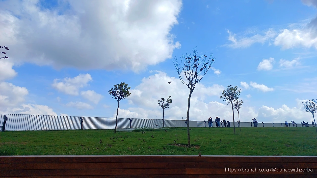낮은 언덕 정상에 이르자, 보스포루스 해협이 한눈에 들어온다. 아래서 바라본 느낌과 확연히 다른 뷰와 바람이 기다리고 있다. 햇살은 물결 위에 부서지고, 점심 무렵의 바다는 유난히 깊은 청록빛이다. 바람은 따뜻했지만 그 안에는 바다의 기운이 섞여 있다.