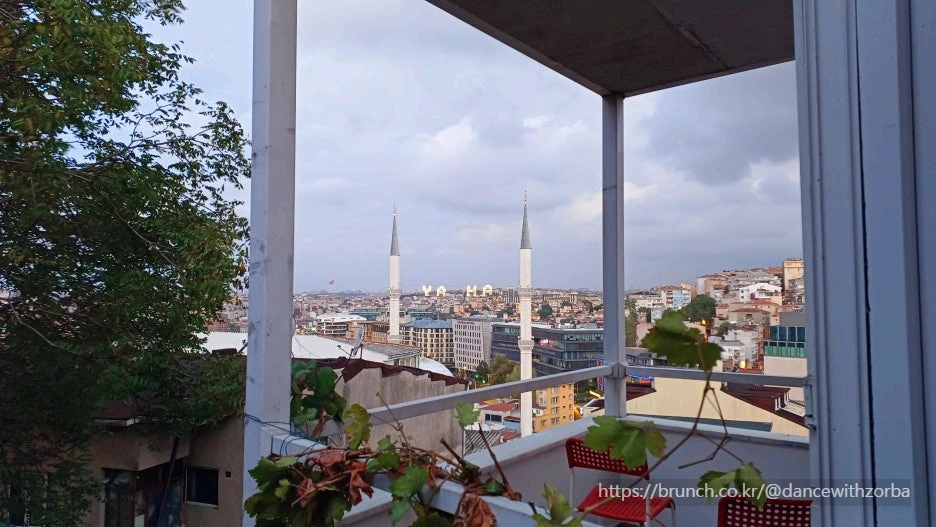 발코니 문을 열자, 차가운 공기가 얼굴을 스친다. 이스탄불은 생각보다 언덕이 많다. 숙소가 높은 곳에 있어서인지, 멀리 도시의 지붕들이 겹겹이 이어진다. 불규칙하게 놓인 집들의 벽은 흙빛, 회색, 그리고 붉은색의 조합으로 이어지고, 그 사이로 가느다란 굴뚝이 솟아 있다. 오른편으로 모스크의 미나렛(첨탑)이 보인다. 아잔이 유난히 또렷하게 들렸던 건 바로 그 탁심 모스크가 숙소와 멀지 않기 때문이었다.