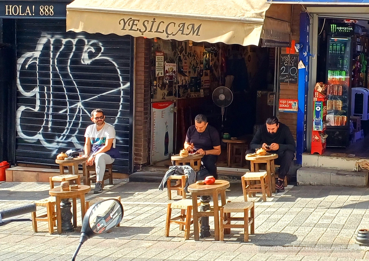 그래도 미련이 남아 근처의 유명하다는 코코레치(Kokorec) 식당으로 향한다. 양의 내장을 꼬치에 감아 숯불에 구운 음식이다. 버거 형태로 나온 코코레치를 한 입 베어 문다. 기름기와 향이 강하고, 식감은 조금 질기다. 순수한 구이 형태의 음식을 하나 더 주문했지만 역시 마찬가지다. 맛이 없다고 할 수는 없지만, 한 입 베어 물어 씹었을 때 나와야 하는 기본적인 감탄은 배꼽 아래서 꿈쩍하지 않는다. 터키 음식이 우리 입맛에 맞지 않는 것일까, 아니면 내가 식당을 잘못 고른 것일까. 거리를 걸으며 나는 그 답을 찾지 못했다. 사람들은 여전히 즐겁게 식사하고, 카페마다 웃음소리가 흘러나오고 있다.