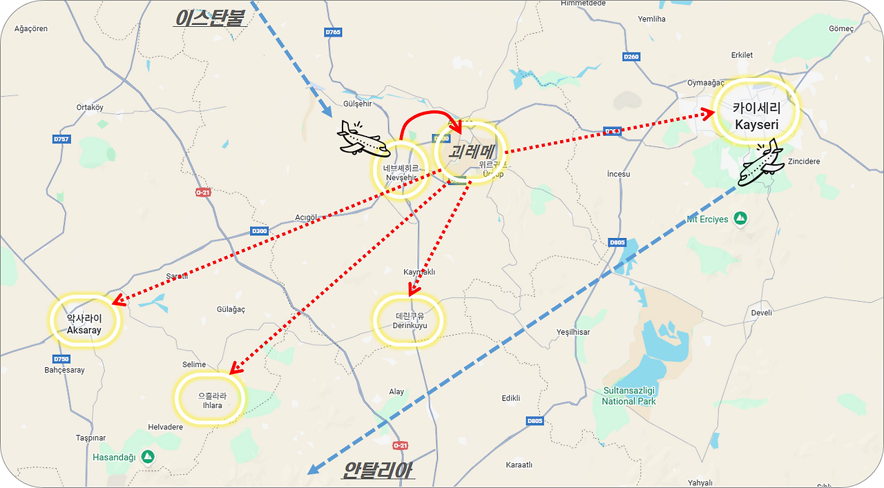 사실, 지금 지도에서 ‘카파도키아’라는 이름은 찾을 수 없다. 대신 괴레메, 우치히사르, 네브셰히르 같은 작은 도시들이 그 자리를 채운다. 하지만 사람들은 여전히 이곳을 ‘카파도키아’라 부른다. 고대 페르시아어 Katpatuka, ‘아름다운 말들의 땅’이라는 뜻을 가진 그 이름은, 단순한 지명이 아니라 시간의 기억이기 때문이다. 화산이 남긴 부드러운 돌 위에 사람들이 삶을 새기고, 바위 속에 집을 파고, 신앙을 숨기던 시절의 흔적이 오늘도 이 대지 위에 고스란이 남아 있다.