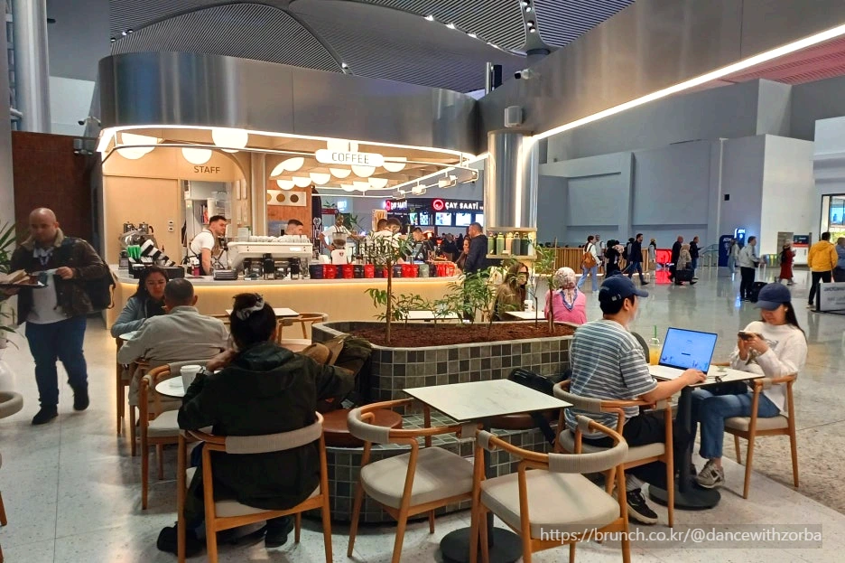 다시 봐도 이스탄불 공항은 크다. 도시 자체가 대륙의 경계라면, 공항은 그 경계의 심장 같다. 일찍 움직인 덕분에 시간은 여유롭다. 유리 벽 너머로 수많은 비행기가 쉼 없이 들고 난다. 사람들은 저마다의 속도로 게이트를 찾아 걷고, 면세점의 불빛은 밤과 낮의 구분선을 지워놓는다. 면세점과 브랜드 매장은 넘치지만, 이상하게 쉴 만한 자리는 드물다. 우리는 탑승 게이트로 가는 길목의 작은 카페에 자리를 잡는다. 비행기 탑승까지 아직 한 시간 이상 남았다.