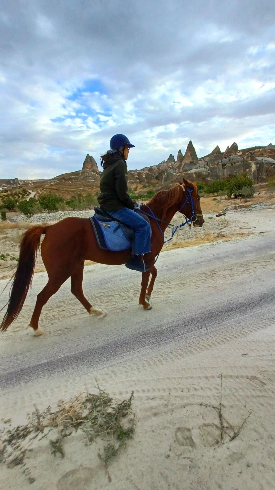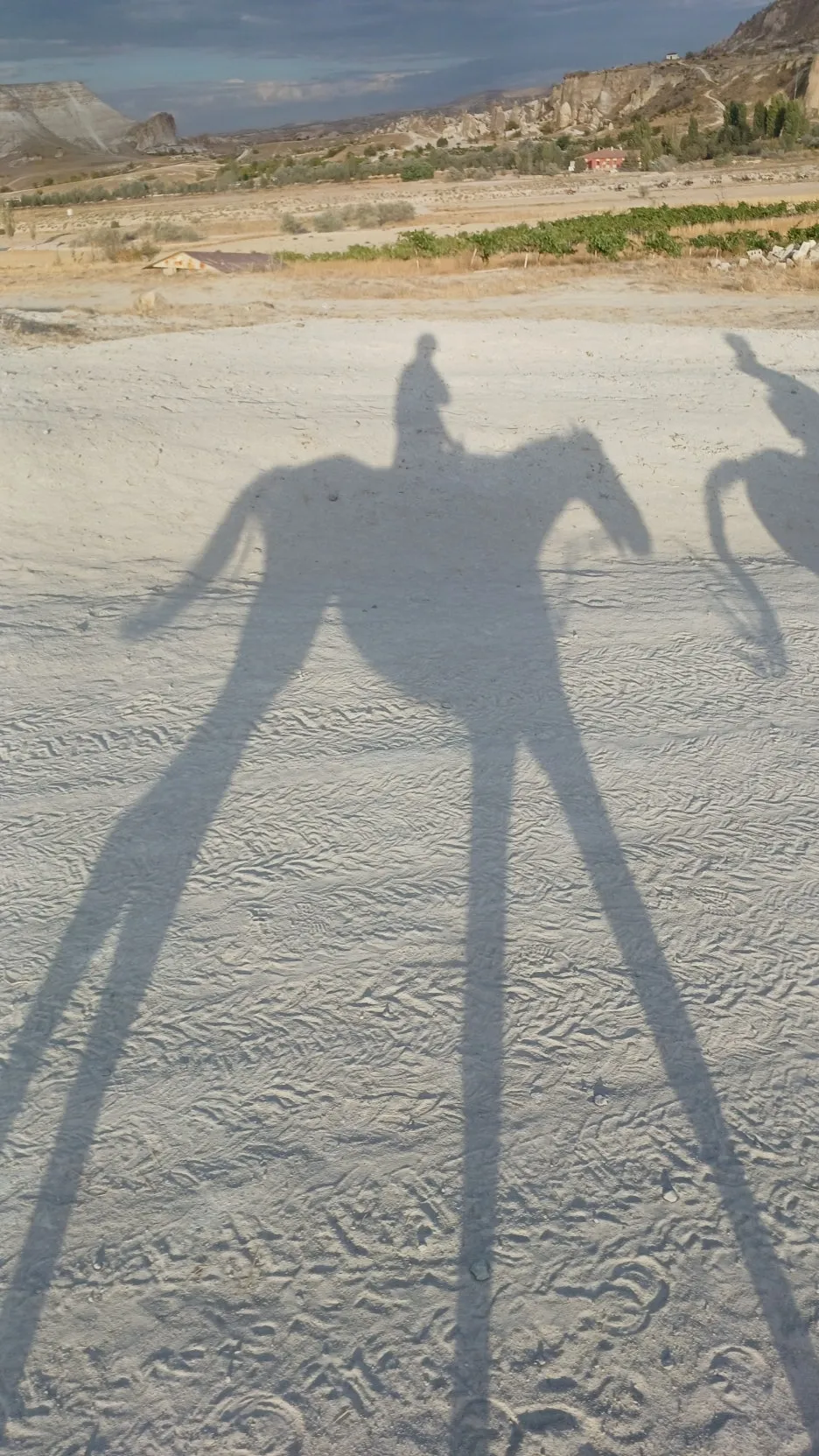 나는 J 뒤에 따라붙으며 안심을 권한다. 다행히 말들은 차분하고 온순했다. 목장을 벗어난 지 5분쯤 되었을까, 사진으로만 보던 '카파도키아'스러운 풍경이 서서히 나타난다. 바위는 불규칙한 조각처럼 솟아 있고, 굴곡진 능선이 회색 흙먼지를 일으키며 이어진다. 하늘은 맑았고, 바람은 건조했다. 승마 행렬은 일렬로 늘어서 천천히 능선을 넘는다. 말 위에서 느껴지는 진동이 처음엔 낯설었지만 곧 리드리컬하게 익숙해진다. 바람이 얼굴을 스치고, 햇살은 어깨에 비스듬히 그러나 사납게 꽂힌다. 괴레메는 아나톨리아 고원의 한가운데 위치해 있다. 해발 1,200 높이의 지역이니 햇살이 강할 수밖에 없다. 말발굽이 흙을 차는 소리가 일정한 박자를 만든다. 이 단조로운 리듬이 마음을 편안하게 한다. 지형은 완만했지만, 때때로 가파른 언덕을 오르내리며 초보자에게도 적당한 스릴을 선사한다.