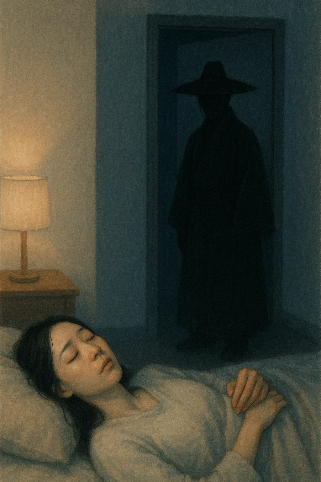 다시 눈을 깜빡이며 쳐다봤을 때는 검은 그림자가 사라졌다. 문 앞에 일렁이는 어두운 그림자가 무섭고 공포스러웠다.