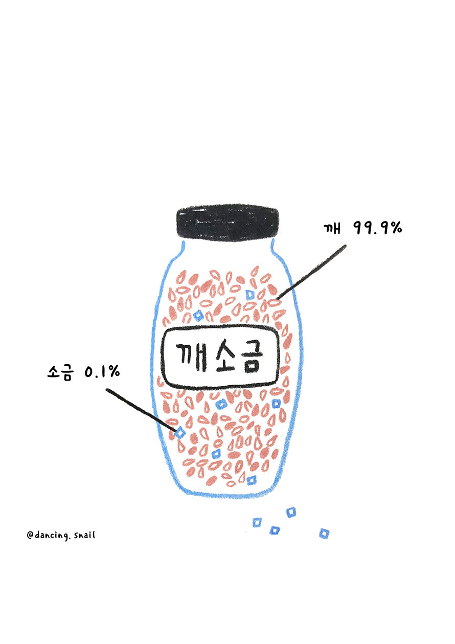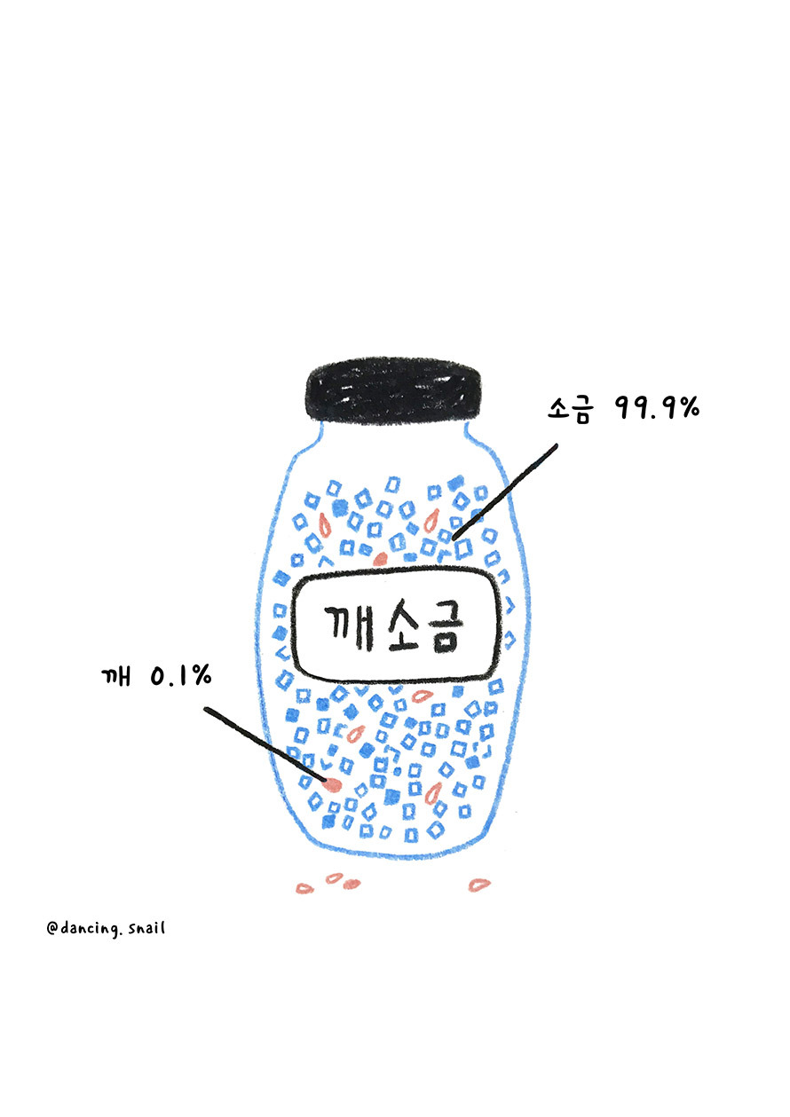 아마도 많은 양의 소금에 깨가 조금 섞여있다고해서 정체성이 크게 변하지는 않지만 많은 양의 깨에 소금이 조금만 들어가 있어도 그건 전혀 다른 차원의 조미료가 되기 때문은 아닐까.