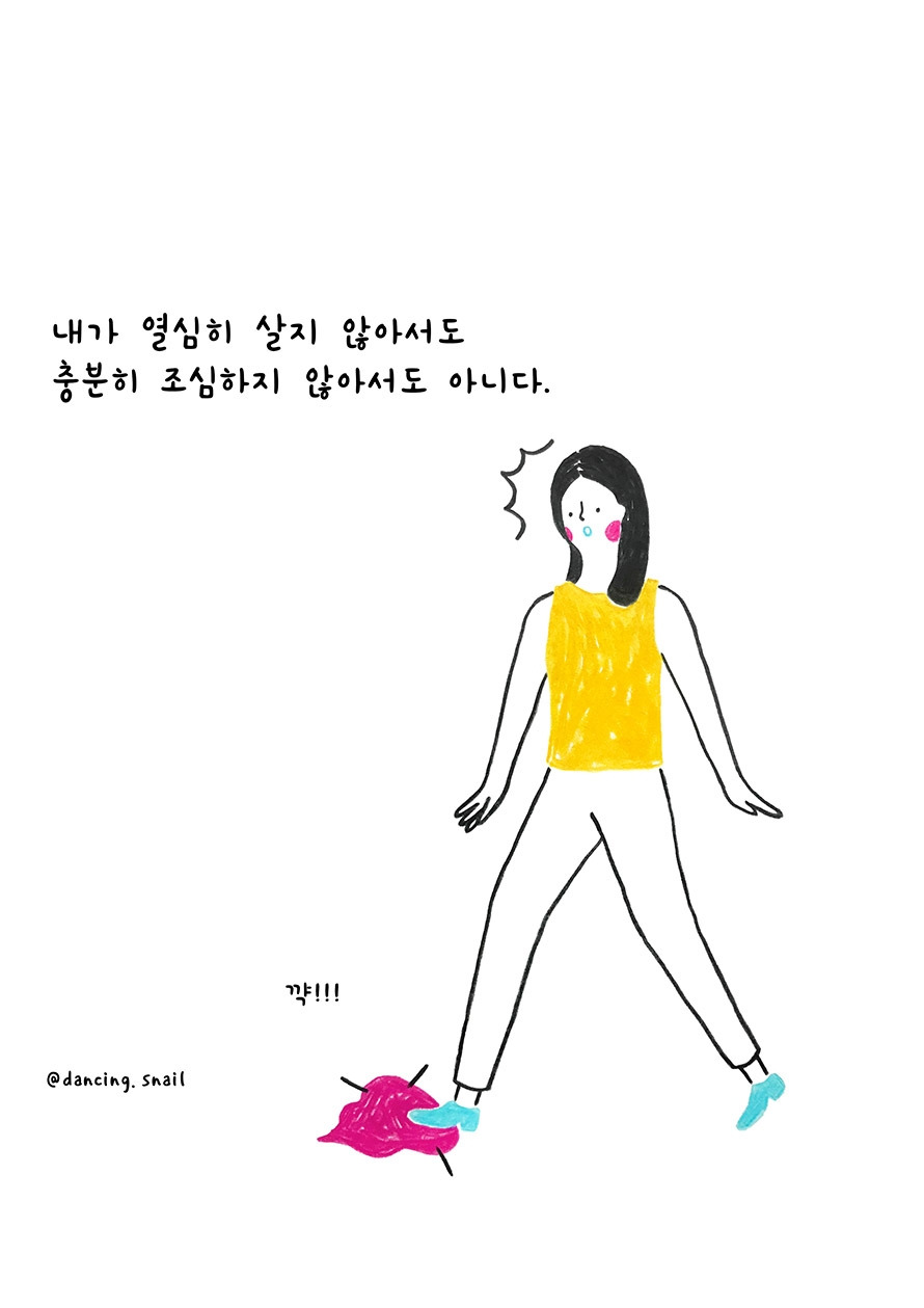 그러나 우리가 아무리 조심하며 살아간다 해도 억울한 상황에 휘말리게 될 수가 있다. 그럴 때 상황과 나 사이의 인과관계를 만드는 식의 운명론적 사고에 빠지지 않도록 조심해야 한다. ‘왜 하필 나한테만 이런 일이?’ ‘이번 달 별자리 운세가 안 좋더라니. 역시…’ ‘이런 일이 생긴 게 다 나 때문인 거 아닐까?’ 같은 생각은 하지 말아야 한다. 내가 얼마나 선량하게 살아왔는지와는 관계없이 어떤 일들은 그냥 일어나기도 한다. 그러니 어떤 상황에 부딪히더라도 우리는 그 상처에 무너지지 않을 권리가 있다.