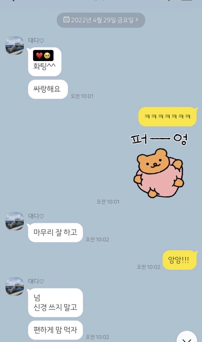 몇 번이고 같은 노래를 반복 재생하며 듣고 있는데 아빠한테서 문자가 왔다. 아빠는 내 마지막 출근길이 내심 맘에 쓰였던 모양이다. 굿모닝 인사도 없이 훅 치고 들어온 '화이팅! 사랑해요'에 눈시울이 좀 붉어졌지만 'ㅋㅋㅋ'으로 가득 채운 카톡을 보내며 아무렇지 않다는 듯 씩씩하게 답장했다. 권고사직으로 회사를 나오게 됐다는 소식을 맨 처음 전한 날부터 마지막 출근 날까지 아빠는 '너무 신경 쓰지 말고 마음 편하게 먹자'라는 말로 조급한 내 맘을 달래주었다. 언제든 날 응원해 주고 지지해 주는 가족이 있음에 힘이 났다.