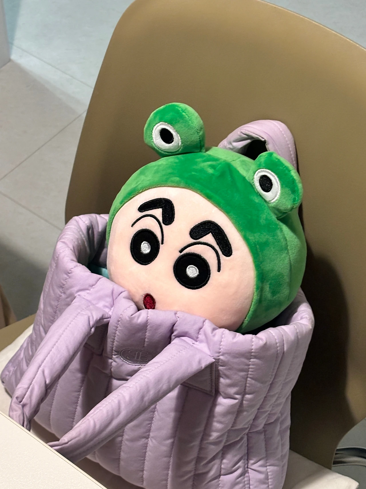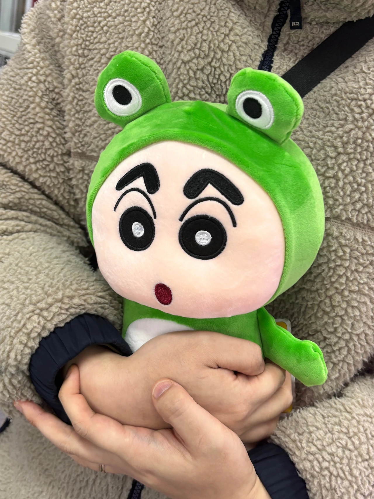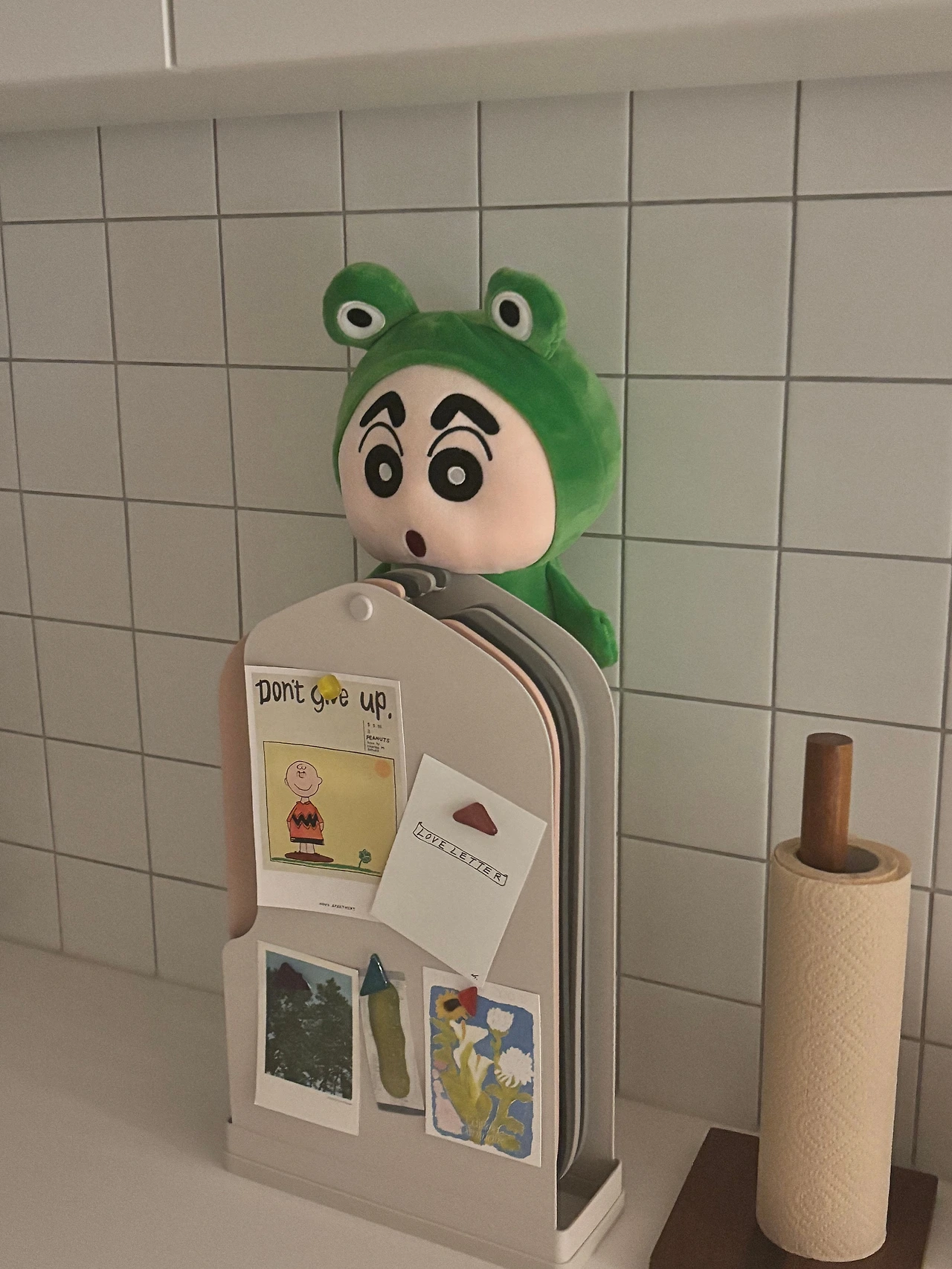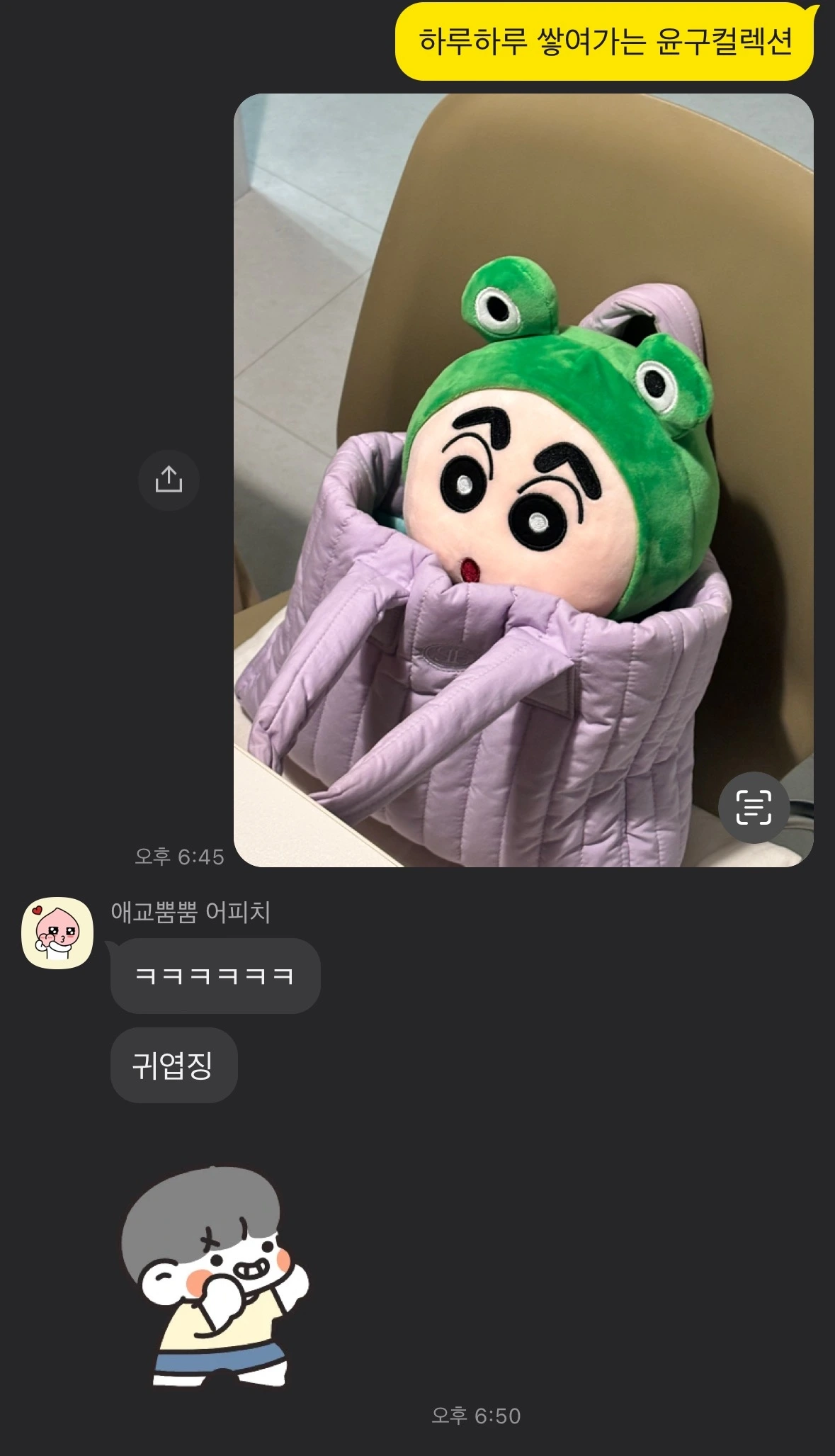 퇴근길 버스를 기다리며 잠깐 들른 인형 뽑기 가게에서 개구리 탈을 쓴 짱구 인형을 만났다. 평소 나를 개구리라 놀리는 오빠는 저건 무조건 뽑아야 한다며 현금을 꺼내 들었고, 두 번의 시도 끝에 기어코 뽑기에 성공했다. 우리 집에 더 이상의 인형은 안된다고 말한 나였지만 아이처럼 좋아하며 인형을 품에 안고 있는 오빠의 모습에 웃음이 새어 나왔다.
