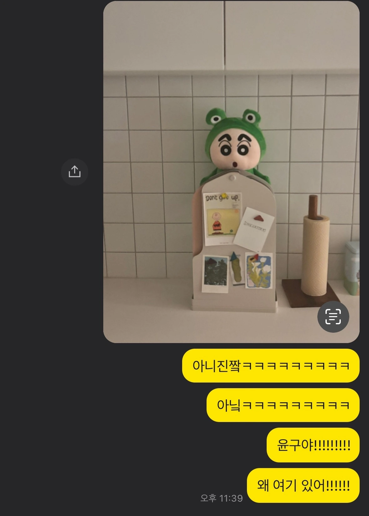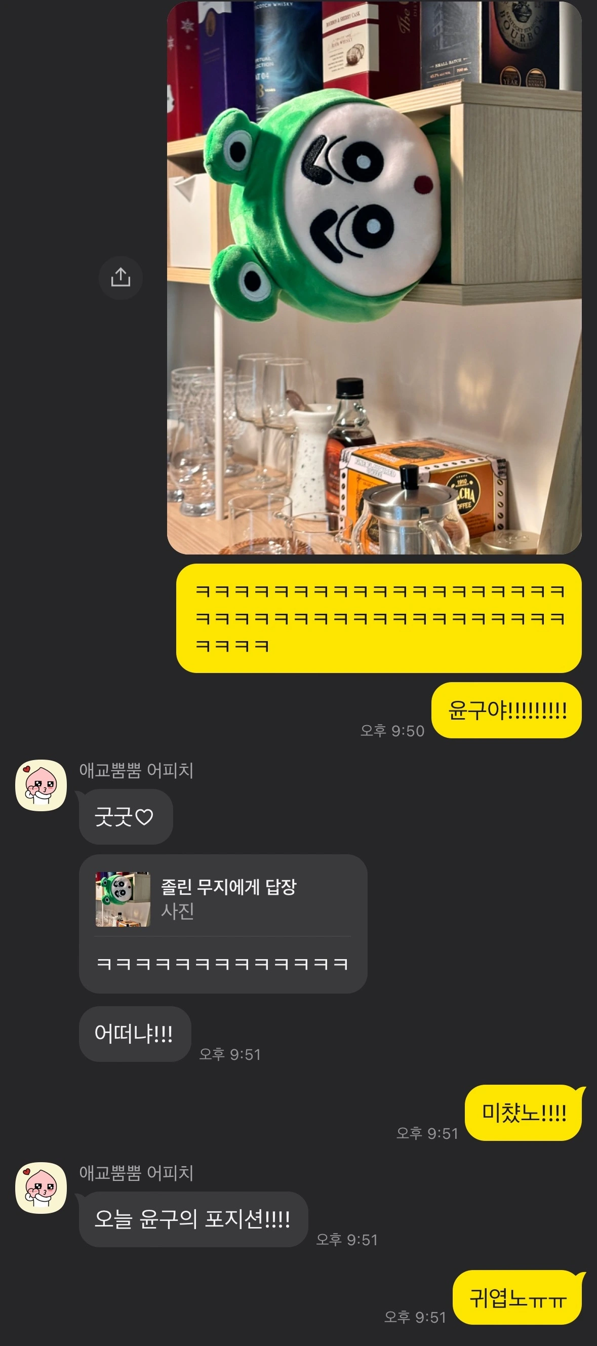 오빠는 얘한테 이름도 지어줬다. 이름은 윤구. 내 성인 '윤'과 개구리의 '구'를 딴 이름이었다. 평소 춘식이와 라이언으로 장난치기 좋아했던 오빠에게 윤구는 새로운 놀잇감이 되었다. 이를테면 출근 전에 윤구를 집안 어딘가에 배치해 두는 식. 방심하고 있던 순간 예상치도 못했던 곳에서 튀어나오는 윤구를 보며 나는 깜짝 놀랐고, 그런 나를 보며 오빠는 낄낄대고 웃는 나날이 한동안 반복되었다.