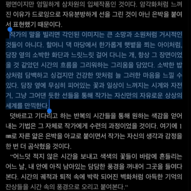 내년 위시리스트가 벌써 하나 생겼다. 키아프 2025를 사랑하는 사람과 같이 보는 것! 가능하다면 참여 작가들에 대해서도 미리 알아보고 평일에 하루 온종일 천천히 작품을 둘러보고 싶은 마음이 생겼다. 우리 둘은 어떤 작품에 마음을 줄지, 어떤 생각과 말을 주고 받을지 기대된다. 그리고 올해든 내년이든 혹은 그 이후든 윤미선 작가님이 개인전을 연다면 꼭 가보고 싶다. 작가님의 작품으로만 가득한 전시장. 생각만 해도 설렌다.