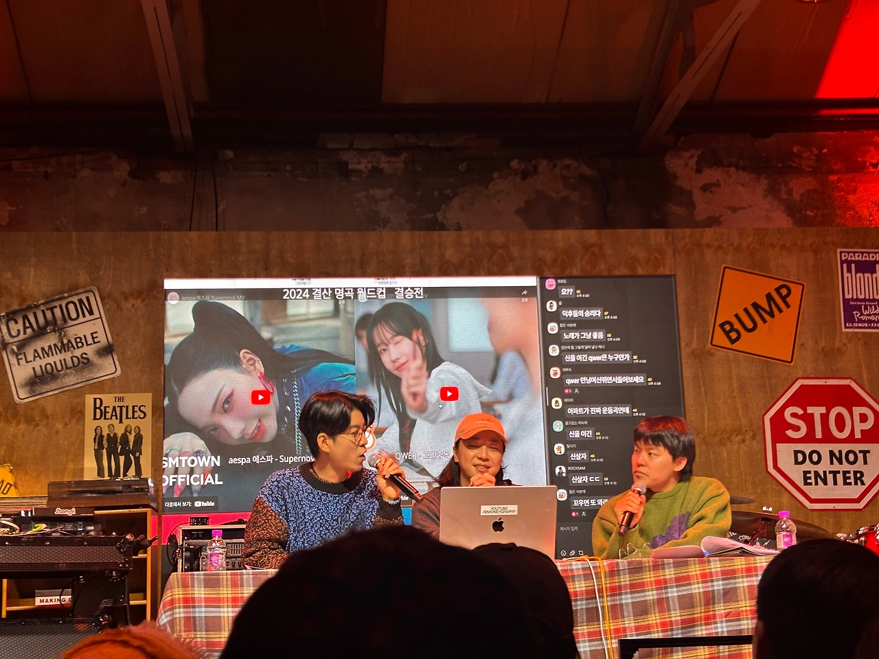 우키팝, 룩쌈, 그리고 스페셜 게스트 넉살과 함께한 2024 결산 명곡 월드컵은 오픈 채팅방을 통해 같이 투표할 수 있는 장치를 마련한 것이 눈여겨볼 만한 포인트였다. 올 한 해 발매된 곡의 뮤직 비디오를 같이 보고 들으며 '아, 맞아 저 노래도 있었지' 돌이켜 보게 되더라. 한 해가 가고 있음을 체감하는 순간이기도 했다.
