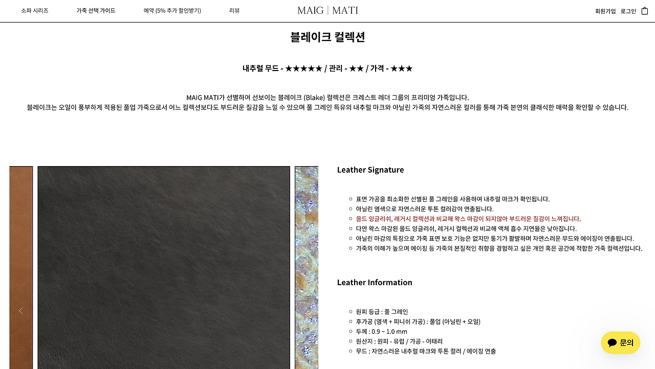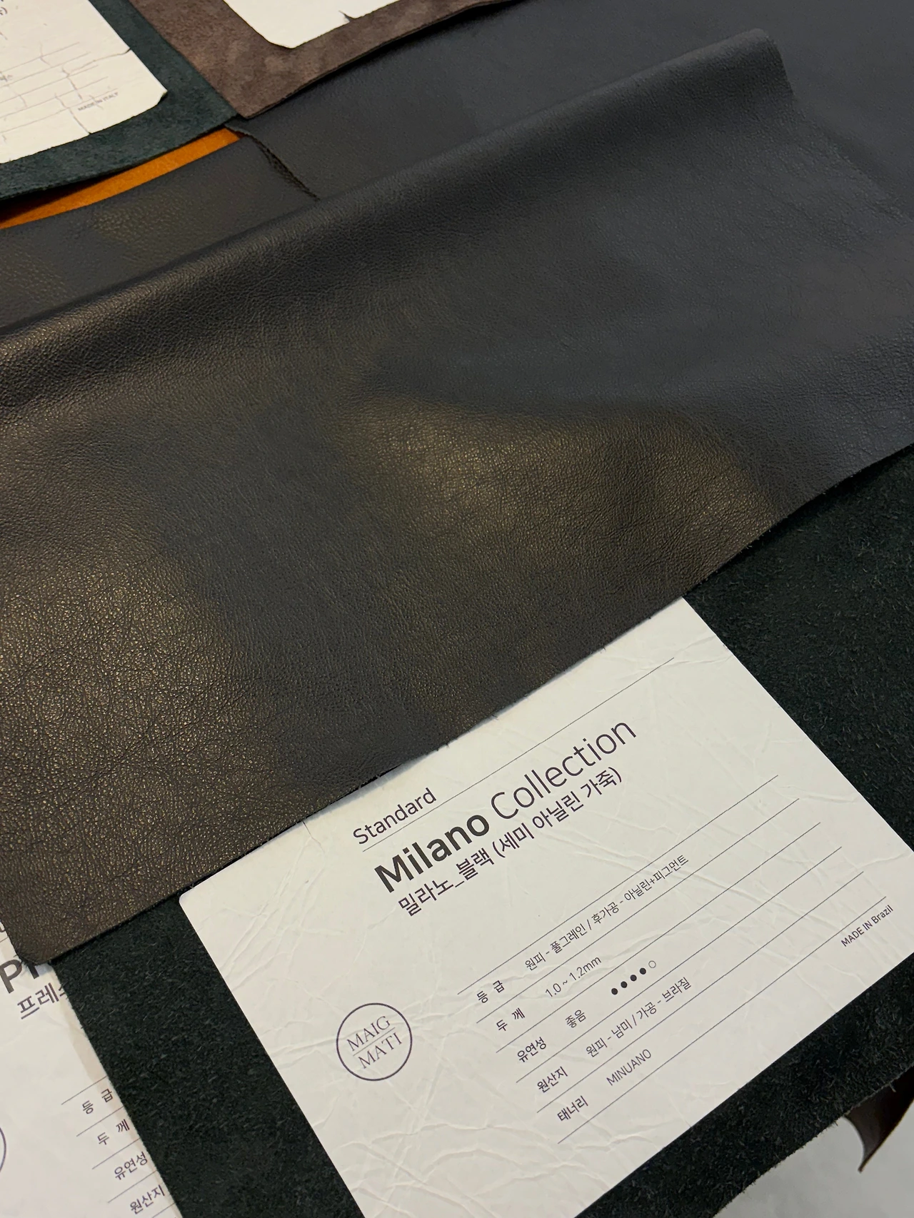 메이그 마티 프리미엄 가죽의 스탠다드 라인(코렉티드 그레인) 과 프리미엄 라인(풀 그레인) 을 비교해 보니 확실히 인위적인 공정이 최소화된 프리미엄 라인이 좀 더 멋스러운 느낌이 있더라. 시간이 지날수록 자연스레 에이징이 되는 가죽의 멋을 누리고 즐기기에는 프리미엄 라인이 더 적합하다고 판단, 우리는 프리미엄 라인 중 '블레이크' 를 최종적으로 선택했다.