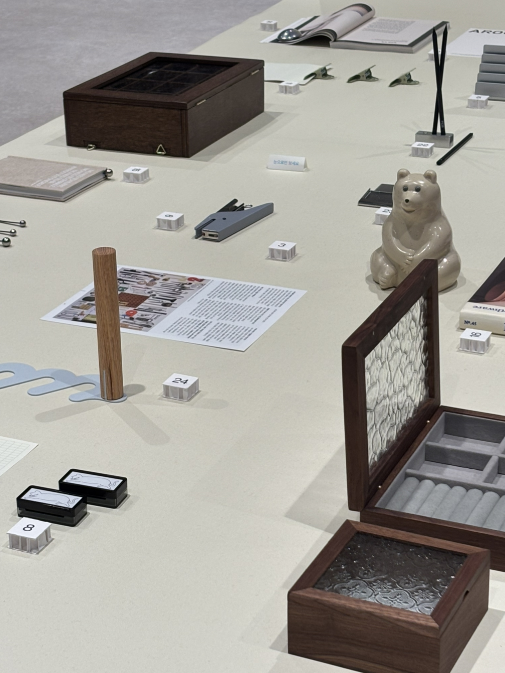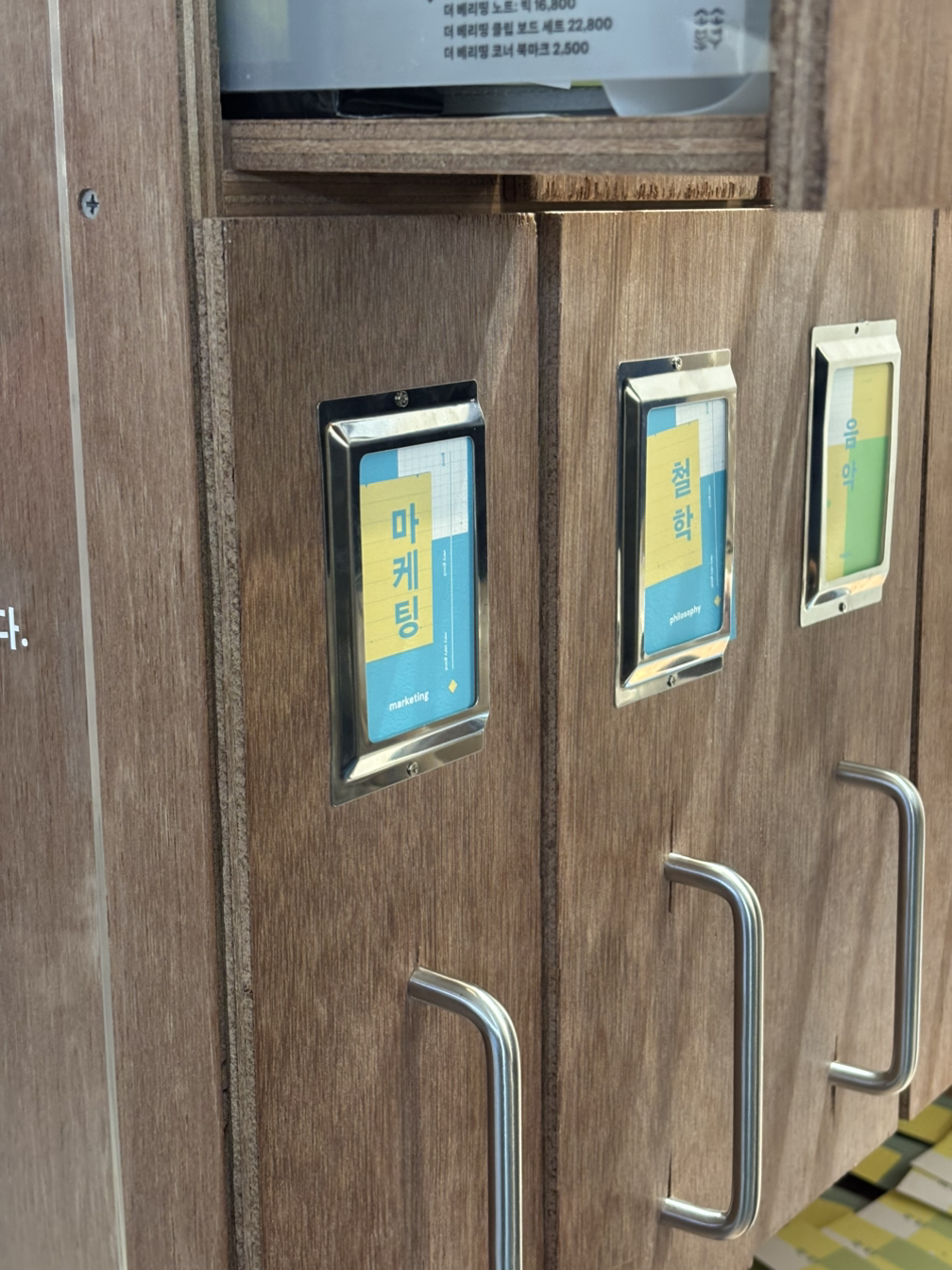 소소문구 전시의 키워드는 '배움' 이었다. 배움의 주제를 마케팅, 철학, 개발, 디자인 등으로 나누고 그 카테고리에 딱 맞는 자사 제품들을 큐레이션 했다. 서랍을 열었을 때 관련 제품을 보여주는 방식도 신선했다. 다만 전시 공간이 굉장히 협소했는지라, 모든 서랍을 하나씩 열어보기엔 어려움이 있어 아쉬웠다.