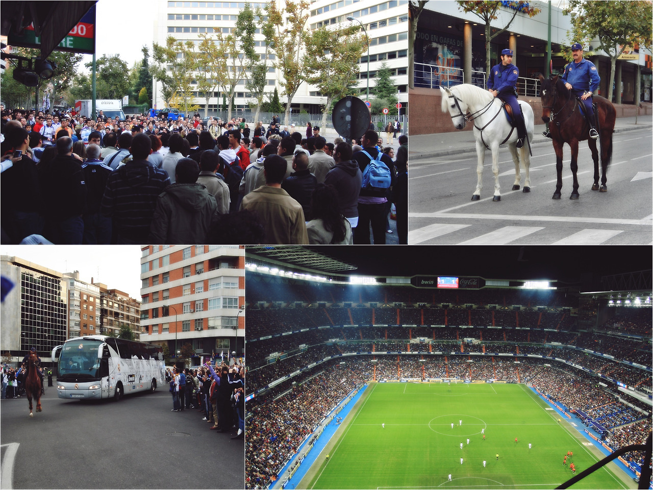 동서남북 어디로 눈을 돌려 보아도 보이는 것은 모두 레알 마드리드의 경기를 보러 온 사람들이었다. 삼삼오오 무리를 지은 아이들은 흥에 겨운 표정을 짓고 있었고 누군가 흥얼거리는 레알 마드리드의 응원 곡은 곧이어 모르는 이들도 다 함께 부르는 노래로 번져 나갔다. 그렇게 모여든 인파가 시간이 지날수록 더욱더 늘어난 것은 당연했다. 결국 오후 다섯 시가 넘어가자 경찰들이 나타나 인파를 통제하기 시작했다. 한 출입구 앞에 유난스레 많은 팬들이 모여 있어 그곳이 바로 레알 마드리드의 버스가 들어가는 곳임을 어렵지 않게 알 수 있었다. 당연히 인파를 통제하는 움직임도 그곳에서부터 시작되었는데, 사람들은 경찰의 손짓에 조금씩 뒷걸음질을 치면서도 쉽게 자리를 뜨진 않았다. 결국 양쪽으로 갈라선 사람들은 겹겹이 줄을 만들어 섰고 그 사이 텅 빈 도로 위로 네 마리 말 위에 올라탄 경찰들만이 오고 갈 뿐이었다.