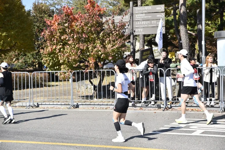 주로에서 러닝 크루 동기를 만나 파이팅을 건넸다.