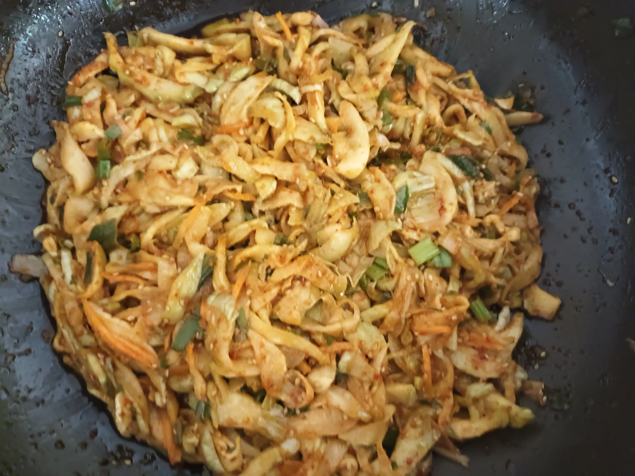 긴 나무젓가락으로 익어가는 노릇한 면을 심술쟁이처럼 마구마구 흐뜨러본다.