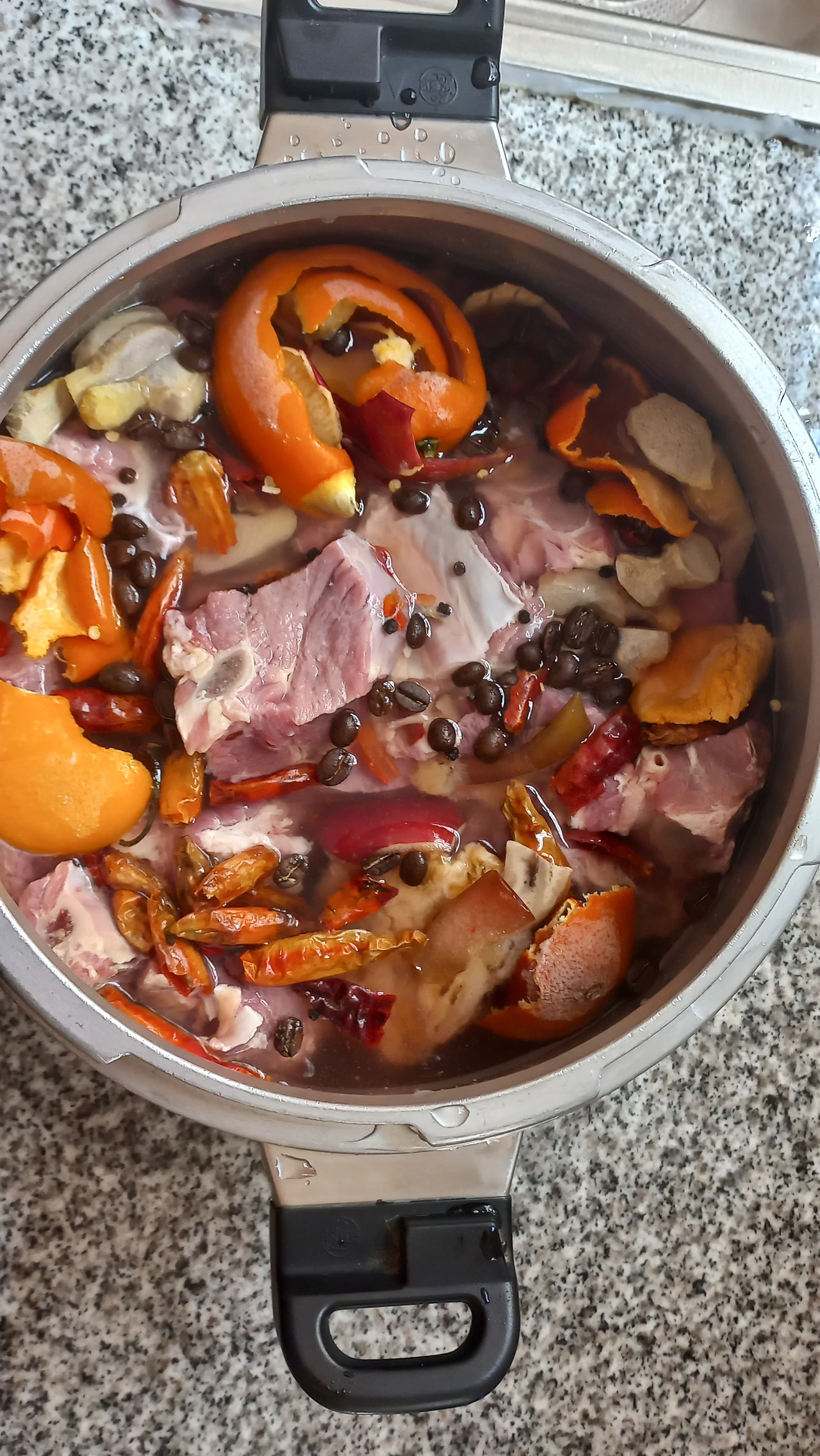 요리 전용 압력밥솥에 손질한 갈비와 물을 넣고는 냉동고에 얼려 놓은 귤과 사과 껍질, 바나나, 마른 고추, 편으로 썰어 놓은 생강, 통후추와 커피빈까지 넣었다. 가스 불은 가장 센 불로 켰다. 밥솥 추가 돌아가기 시작하면 불을 중간으로 맞추고는 20분간 더 삶아 준다. 추의 김이 다 빠지면 고기만 건져 내어 불순물을 제거한다. 깔끔이 씻은 압력솥에다시 갈비를 넣고 간장과 굴소스, 소금, 후춧가루, 설탕, 생강가루와 다진 마늘을 넣어 잘 섞어놓는다. 2시간쯤 재워 놓은 갈비에 보랏빛 양파와 포슬포슬한 감자와 단감처럼 달달하고 단단한 당근을 썰어 넣었다. 마지막으로 빠질 수 없는 참기름과 물을 넣어 모든 재료들을 섞은 후뚜껑을 살짝 덮고 15분쯤 끓여 주면 갈비찜 요리는 완성이 된다.