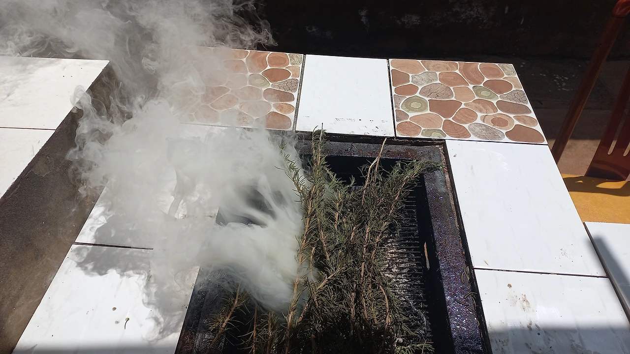 그날 오후 집으로 돌아온 나는 바구니에 수북이 담아 두었던 잘 마른 로즈메리 가지를 꺼내 들었다. 큰 아이가 학교에서 만들어 온 생선 모양의 도자기 위에 로즈메리의 가지를 반으로 잘라 성냥으로 불을 붙였다. 마른 로즈메리가 '타다닥' 타 들어가며 향긋한 냄새가 집안으로 퍼졌다. 특별히 생선이나 삼겹살을 구운 날에는 로즈 메리를 태우면 한방에 냄새를 잡아 준다. 밖에서 숯불에 고기를 구웠다. 집안에서 진한 향기를 다 뿜어내고 바싹 마른 로즈메리를 갖고 나온다. 남아있는 불꽃에 이놈을 얹어 놓으니 모기풀처럼 사방팔방으로 연기가 퍼지면서모든 향기를 쏟아낸다.