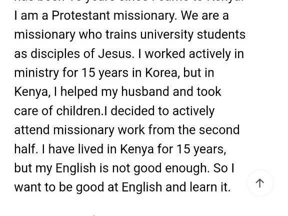 나의 소개를 베티에게하고 싶었다. 미리 준비해 온 내용을 읽다가 케냐에서 남편을 내조하고 아이들을 돌보는 시간이 많았다는대목에서 생각지도않게 눈물이 쏟아졌다. 한국에서는 열심히 선교활동을 했던 반면 케냐에서는그러지 못한큰 이유가 영어였다는 것을 알아채기도 했다. 나는 이제는 현장에서 일하고 싶다고 말했다.