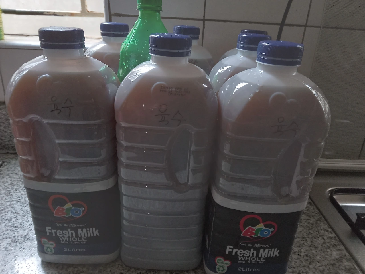 압력솥의 추가 칙칙 거리며 20분쯤 지나면 불을 끄고 한참 후에김이 빠지면 건더기를 건져 내고 육수가 다 식으면 재활용으로 사용하기 위해서 깨끗이 씻어서 말려놓은 우유통으로 옮겨 담는다. 2리터짜리 병으로 약 7병~8병 이상은 족히 넘을 양이니냉동고에서 얼려놓았다가 한 병씩 꺼내 먹을 것이다.