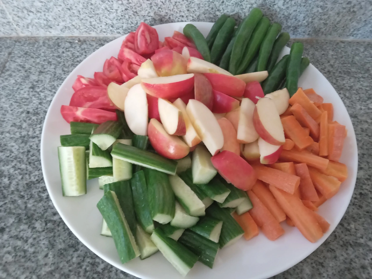 하얀 접시에 알록달록한 먹거리가 가득하다