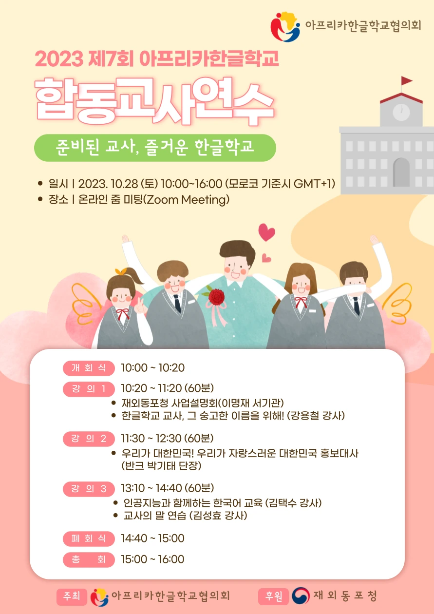 저는 재케냐 한글학교에서 교사로 9년째 봉사하고 있습니다. 최근에 아프리카지역의 한글학교 교사연수가 줌으로 있었습니다. 두 분의 선택식 강사님들이 한글학교 선생님들께 위로하셨던 말씀이 기억이 납니다. 해외한글학교에서 봉사하는 선생님들이 가르치는 일보다 먼저 행복하셨으면 좋겠습니다. 그 단순한 말이 참으로 마음을 울렸습니다. 우리, 모두, 다 함께 행복하시길 소망해 봅니다.