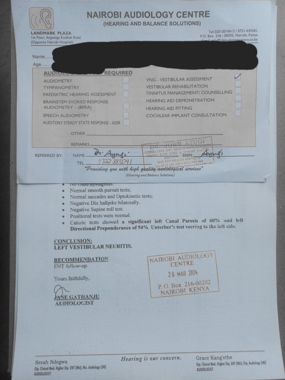 병명이 한국말로 전정 신경염, 검사비는 한화로 150,000원