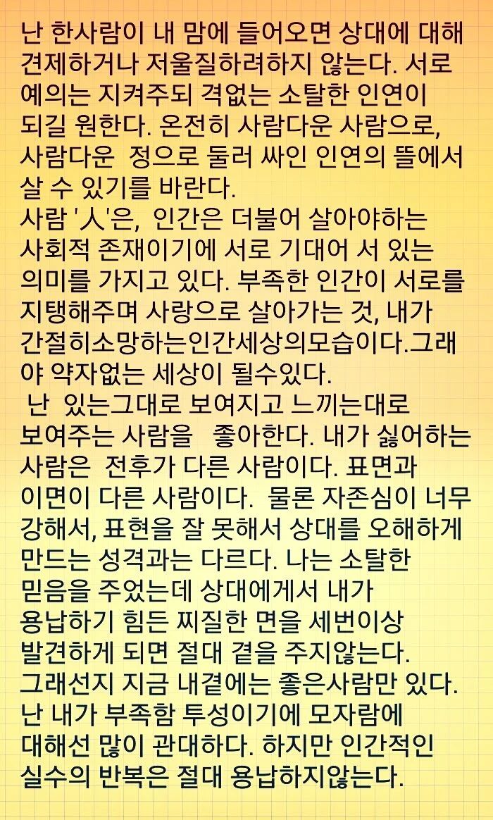 나름의 선함을 지키며 사는 사람들도 많지만 길고긴 인생에서 중요한 것은 타인이 아닌 나를 들여다보는 삶의 자세이다. 나이들수록 내 안의 자아를 들여다보는 성찰의 습관은 더더욱 중요하다. 자신만의 잣대를 벗어나지 못하고 주변을 지휘하려는데 더 집중하는 사람들도 종종 본다. 진정한 리더가 되고 싶다면 내 안의 '나'를, 스스로를 먼저 더 엄격하게 통제할 줄 알아야 한다. 성숙한 인간은 나이듦을 말하는 게 아니다. 완장이나 직책은 당연히 아니다. 자신의 단점을 찾고 고치려 애쓰며 타인을 배려하고 포용하려는 자세가 온 머리와 가슴에 체득될 때, 보다 성숙한 참 인간으로 거듭나게 되는 것이다. 그런 모습은 사람들을 대할 때 자연스럽게 언행에서 드러나게 된다. 하는 척하는 것과는 분명히 구별된다. 그 자연스러움은 언행은 물론이고 얼굴에서도 모습에서도 온화하고 단단한 믿음을 가지게 한다. 10여년 전 쓴 글을 보며 다시 내 스스로도 점검하고 인간에 대한 예의에 대해 좀더 폭넓게 생각하는 마음을 가지고자 한다.
