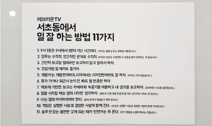 교훈이나 급훈에 해당하는 정도의 '사훈'은 이제 유수의 대기업에서도 찾기 힘들다. 당해연도의 슬로건이 있다든지, 대표이사 바뀔 때 경영 방향을 보여주는 슬로건 같은 식의 것들만 존재한달까? (물론 한자로 도배된 심지어 반짝이는 액자에 잘 걸어놓은 곳도 있겠지요)