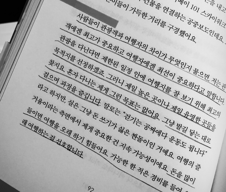 여행에는 여행자의 삶이 반영되어 있으니, 여행에서 삶을 돌아본 그의 생각은 행간에서 읽힌다. 나의 밑줄은 일상을 떠난 여행에서 스스로의 삶을 돌아본 생각에 그어졌다.