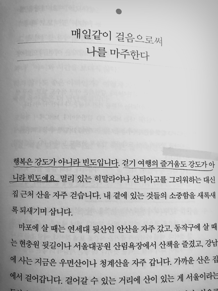 작가는 일상을 즐겁게 하는 방법, 즐거움을 유지하는 것, 그것이야말로 어떤 일을 꾸준히 오래 하는 비결이라고 한다.(280쪽) 내가 좋아하는 일, 최선을 다할 수 있는 일을 찾아 즐겨야겠다. 매일 반복하리라. 무엇이든 가능하게 할 것이다. 즐거우기까지 하다면 꾸준히 오래 할 수 있다. 산을 오르는 가장 확실한 방법은 꾸준히 반복하는 것이라고 했으니까.(295쪽)