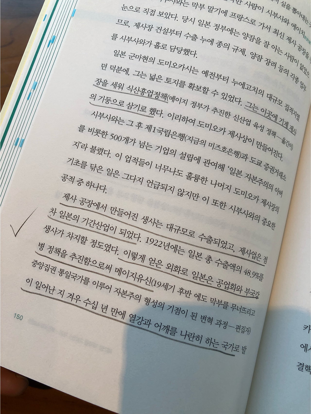 누에고치의 대규모 집적 공장, 즉 기계 제사장을 세운 식산흥업정책을 자랑삼아 이야기한 부분은 당황스럽기까지 했다. 메이지유신으로 세워진 정부는 제사공장에서 만든 생사를 대규모로 수출하였고, 제사업은 일본의 기간산업이 되었으며, 이렇게 얻은 외화로 일본은 공업화와 부국강병 정책을 추진하여 메이지유신 수십 년 만에 열강과 어깨를 나란히 하는 국가가 되었다(150쪽)고 쓰고 있다. 그래서 열강과 어깨를 나란히 하는 국가가 되어서 어떻게 하였는가.