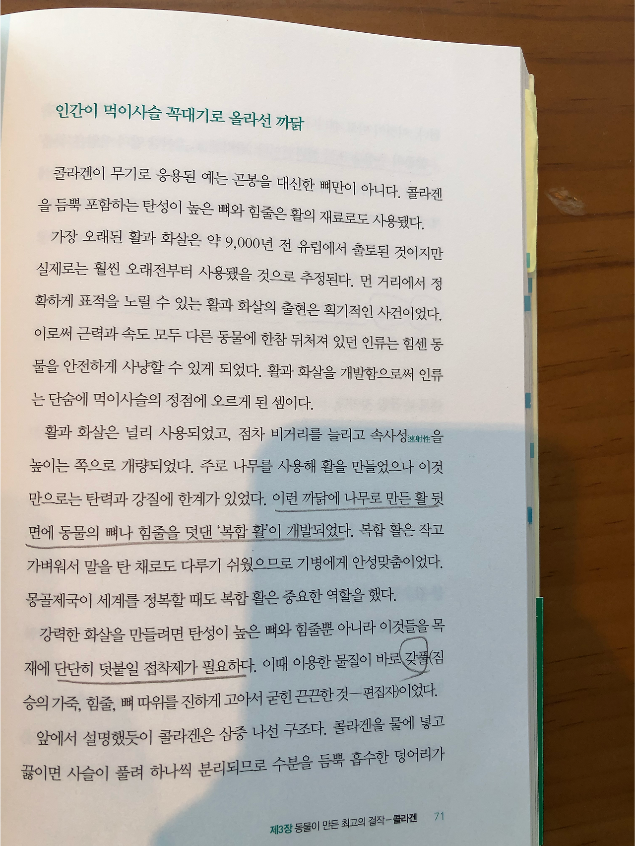 다른 동물보다 인류가 사냥의 힘을 갖게 된 것은 콜라겐의 역할이 있다고 이 책은 소개한다. 나무로 만든 활 뒷면에 동물의 뼈나 힘줄을 덧댄 ‘복합 활’이 개발(70쪽)되었는데, 이것은 콜라겐으로 이루어진 뼈와 힘줄을 이용할 줄 아는 인간의 지혜가 바탕이 된 것이다. 사냥의 획기적 발전의 계기가 되었는데, 이 활을 잘 다룬 몽골민족은 동서양을 넘나들며 제국을 이루었다.