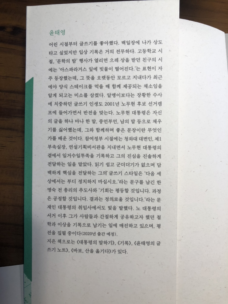 윤태영의 좋은 문장론은 그 고침의 방법을 알기 쉽고 구체적으로 쓰고 있다. 작가가 제시하는 방법론 하나하나를 새겨서 글을 쓰고 고칠 때 체크리스트로 쓰면 나의 글은 조금 더 달라질 것이다. 나는 그런 마음으로 이 책의 곳곳에 밑줄을 긋고 포스트잇을 붙였다. 내 글이 시간을 들여 고침을 통하여 딱 맞는 한 문장으로 거듭 태어나기를 바라면서.