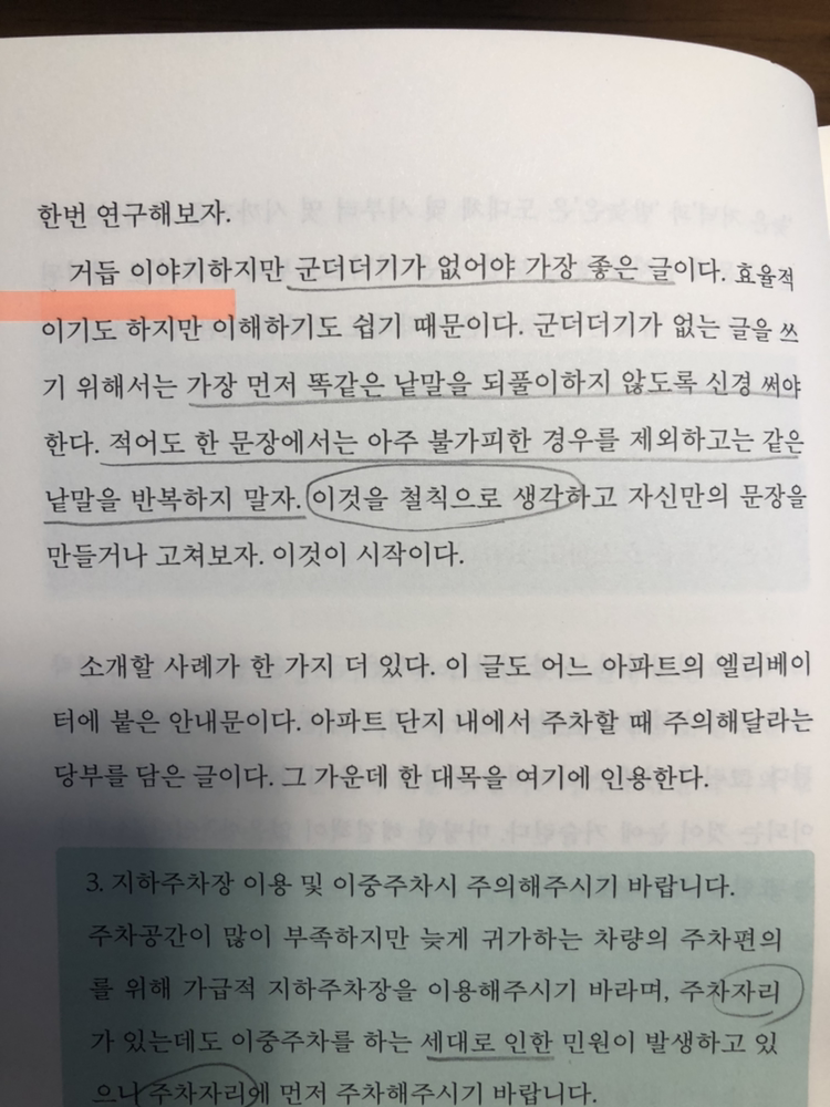 모두가 알고 있으면서도 쉽지 않은 방법이다. 글을 쓰다 보면 굳어진 습관처럼 써지는 문장이 있다. 나도 마찬가지다. 나는 본래 수식어를 길게 쓰는 사람이다. 문장이 길고 추상적인 표현이 많다. 감상적인 글을 좋아하는 취향 때문이기도 했다. 이런 것을 벗어나 보려고 의도적으로 단문을 쓰려고 한다. 단문을 쓰다 보면 호흡이 짧아진다. 툭툭 끊기는 흐름 때문에 글이 재미가 없다. 이 책에서는 이런 단문의 단점을 극복하기 위한 방법도 제시하는데 단문과 복문을 섞어 쓰라든지 대구 표현을 쓰라든가 하는 방법이다. 예시를 같이 제시하다 보니 차이를 분명하게 알게 했다.