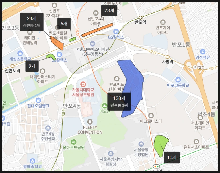 서초동과 반포동 학원가의 특징은 고가 아파트를 중심으로 영유아에 대한 교육 수요는 높다는 것입니다.