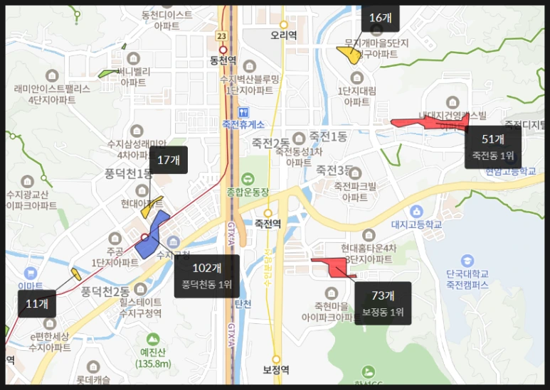 수지구청역과 보정동 죽현 마을 부근, 죽전 대지 마을에 중소형 학원가가 형성되어 있습니다.