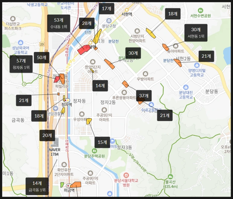 대형 학원가는 없고 서현역과 수내역, 정자역의 주요 명문학교 인근에 중소 규모 학원이 퍼져있습니다.
