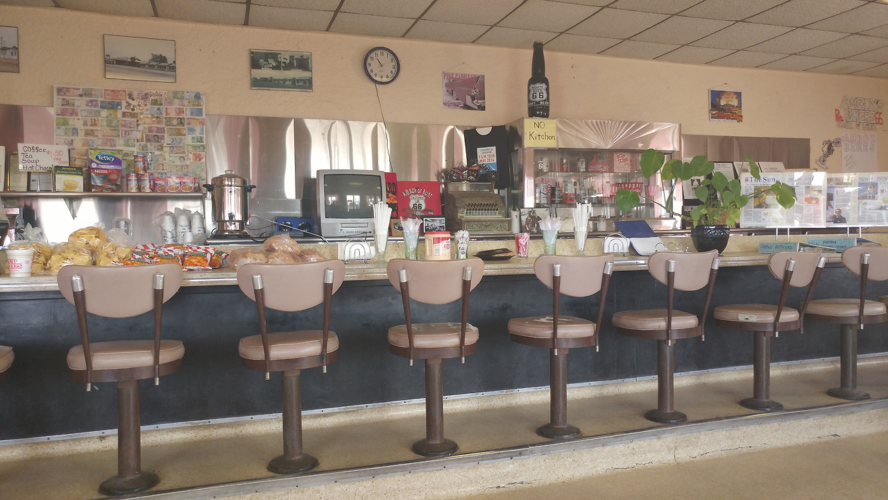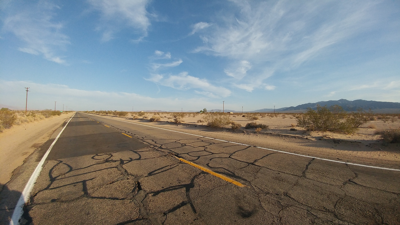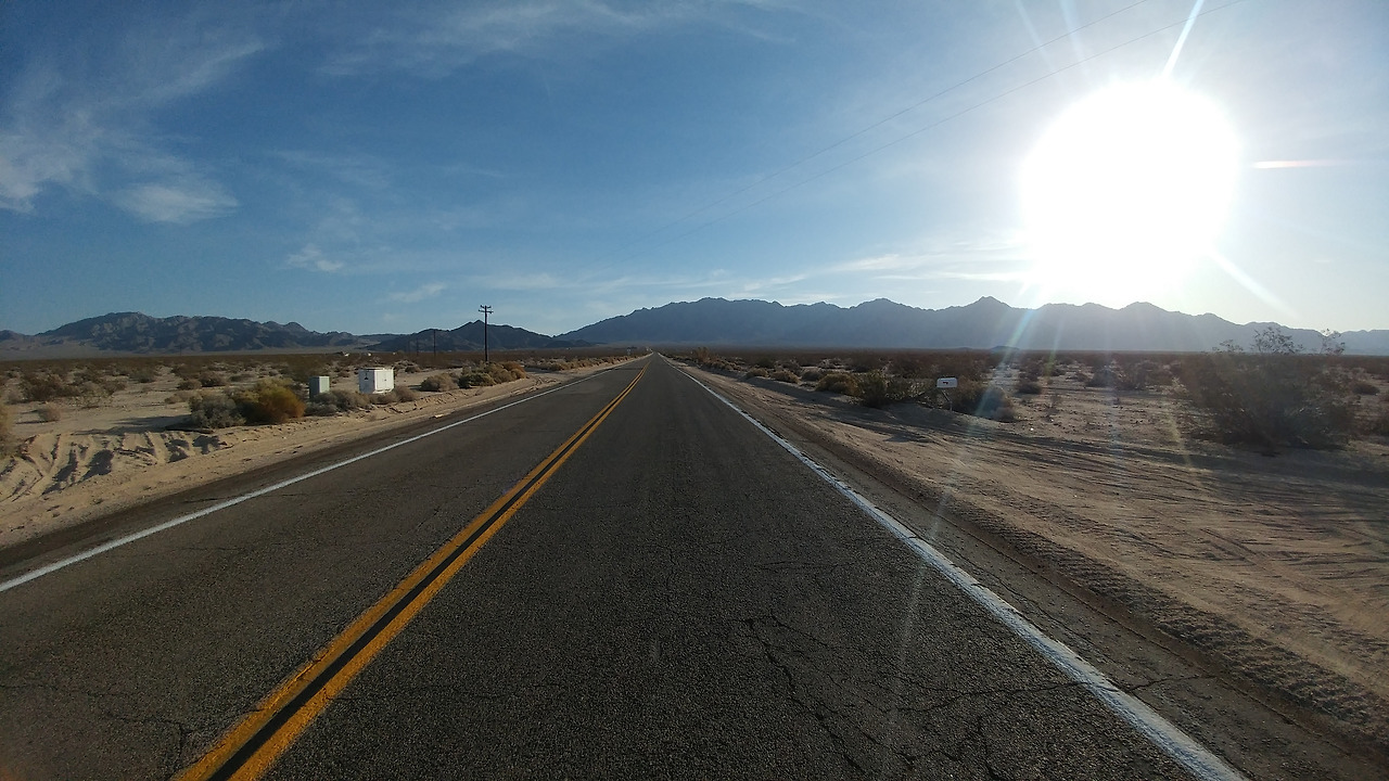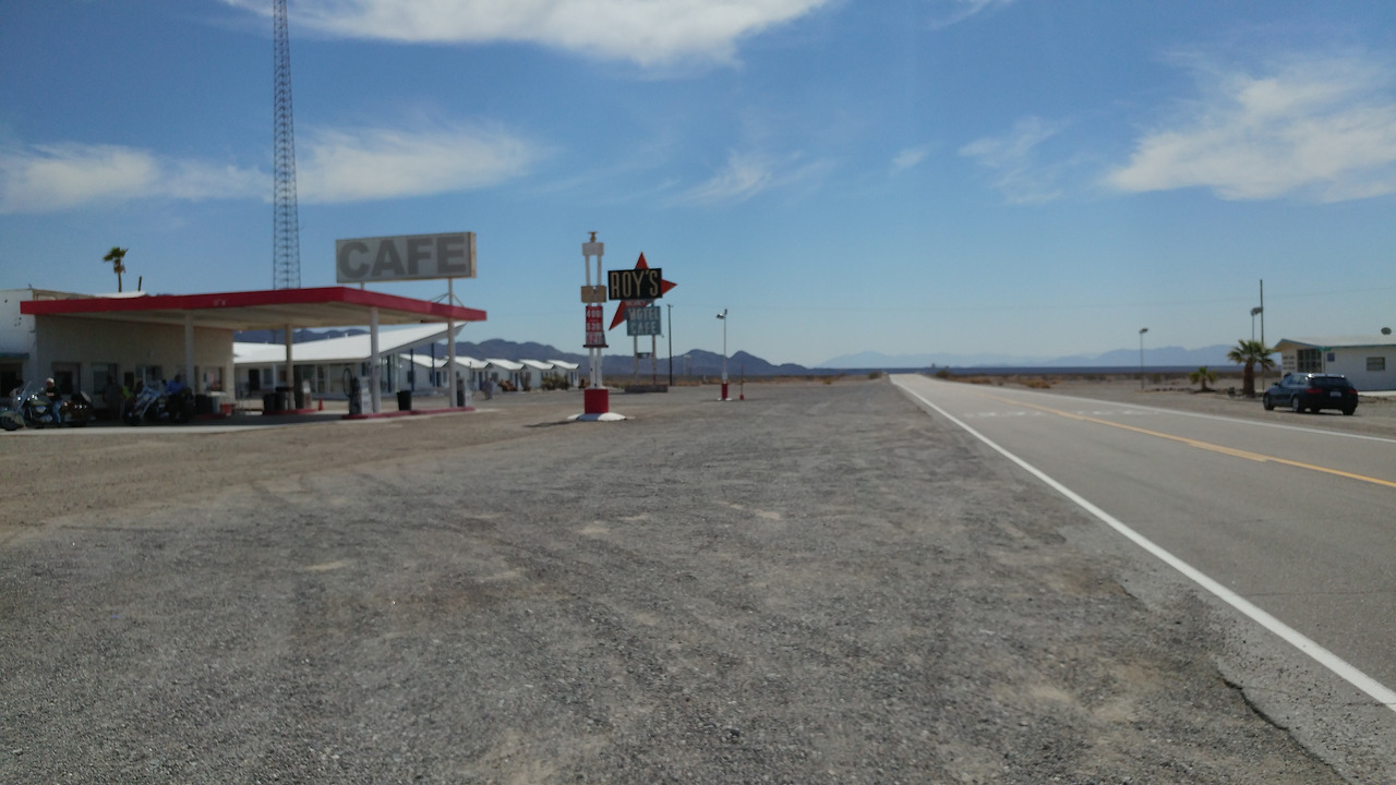 곧바로 Amboy를 향하는 도로로 올랐다. 앞서가기 잔에 Amboy에 대해 설명하자면: Amboy는 사막 한 가운데에 있는 마을로 인구가 4명이다. 주유소 하나와 우체국 하나가 있다. 황무지에 주유소 하나 달랑 있는 곳이지만 여기 말고는 기름을 넣거나 간식을 먹을 곳이 100km 넘도록 없기에 꽤나 붐비는듯 했다.